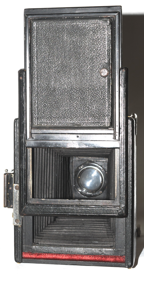 So ganz weiß ich nicht, was ich von ihr halten soll. Nicht zu ihr paßt die Entfernungsskala - die ist nicht original und grob geschätzt für ein 90mm-Objektiv - also grob daneben. Zwei unterschiedliche, professionell erstellte kompatible dünne Holz-Adapterrahmen für Aufnahme von Agfa-Platten einerseits, (Agfa-)Packfilm-Halter andererseits - deuten zumindest auf die Kooperation von Rietschel mit Agfa. Der Compur ist auf 1927 zu datieren, die ganze Konstruktion der Kamera erscheint aber aus Sicht von z.B. 1927 etwas aus der Zeit gefallen. Rätsel gibt die Befestigung des Trageriemens auf einer Seite auf. Es sieht so aus, als wären die Positionen für die Löcher der üblichen Befestigung nur vorgestochen worden. Das Objektiv, ein Agfa-Doppel-Anastigmat (4.5/135mm) erscheint zumindest als gekonnt handwerklich eingepaßt (Kleinstserie? Vielleicht Aufarbeitung von Restbeständen z.B. in der Lehrwerkstatt?).