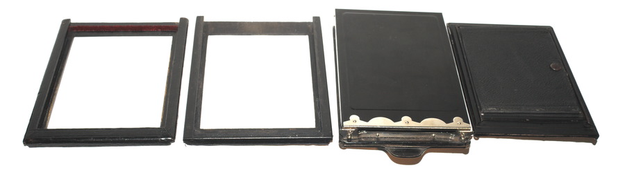 Die "Million-Teile" - Packfilmkassette, Rahmen dafür und für Millionkassetten, sowie eine Holzdoppelkassette, die sich unten nicht voll einschieben läßt - dafür müßte man einiges abhobeln. Daß sie oben überstehen würde, wäre problemlos, da sie durch einen seitlichen Hebel festgehalten wird.