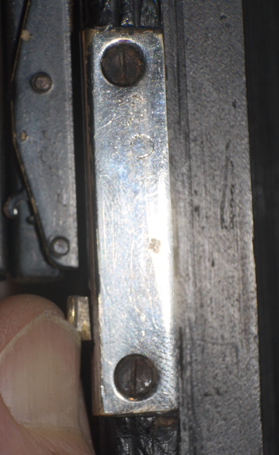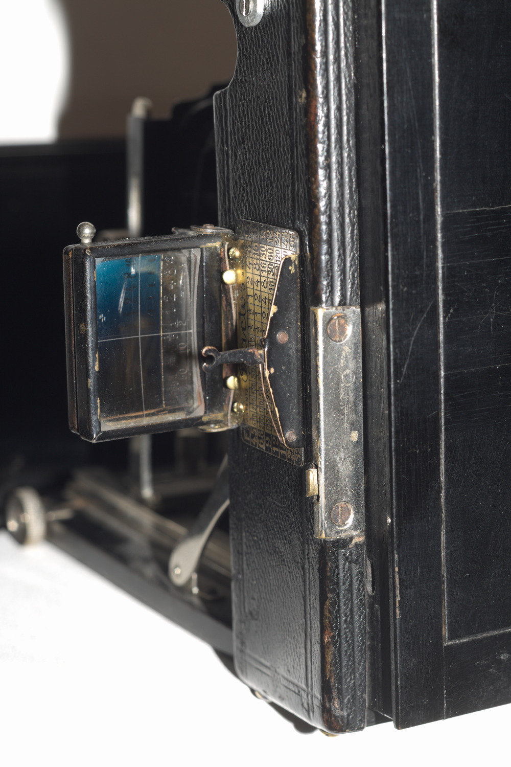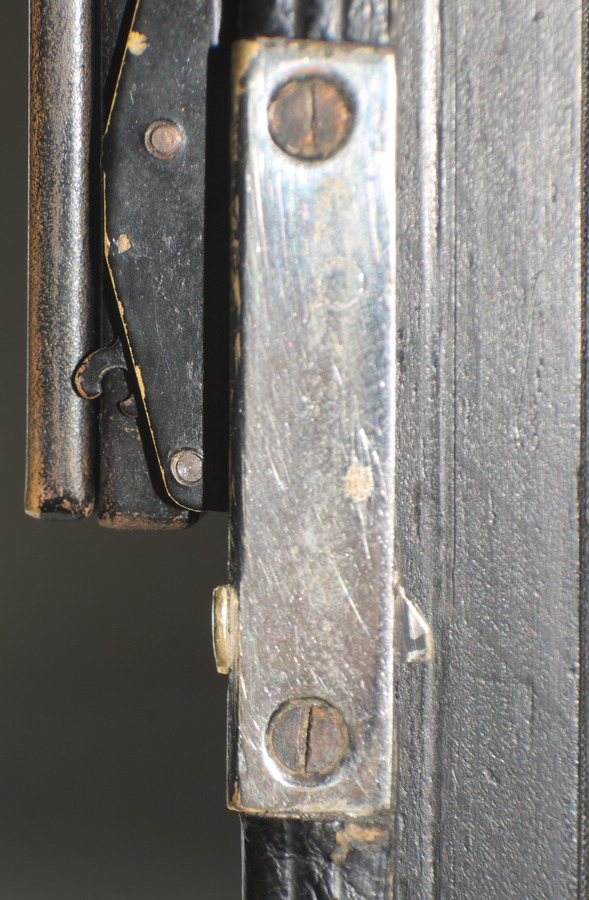 Den mir anfangs als ungewöhnlich erscheinenden Hebel an der Seite weiß ich jetzt also zu deuten. Zwar paßt die abgebildete Holzdoppelkassette (statt eines Adapters) nur "sehr beinahe" - aber es wird klar, daß der Hebel ursprünglich dazu diente, solche Kassetten festzuhalten. Und deshalb verjüngt sich bei diesen Kassetten auch der Falz. Die Kamera war also anfangs für die deutlich größeren und dickeren Holzkassetten gedacht und mit diesem Hebel ausgestattet.