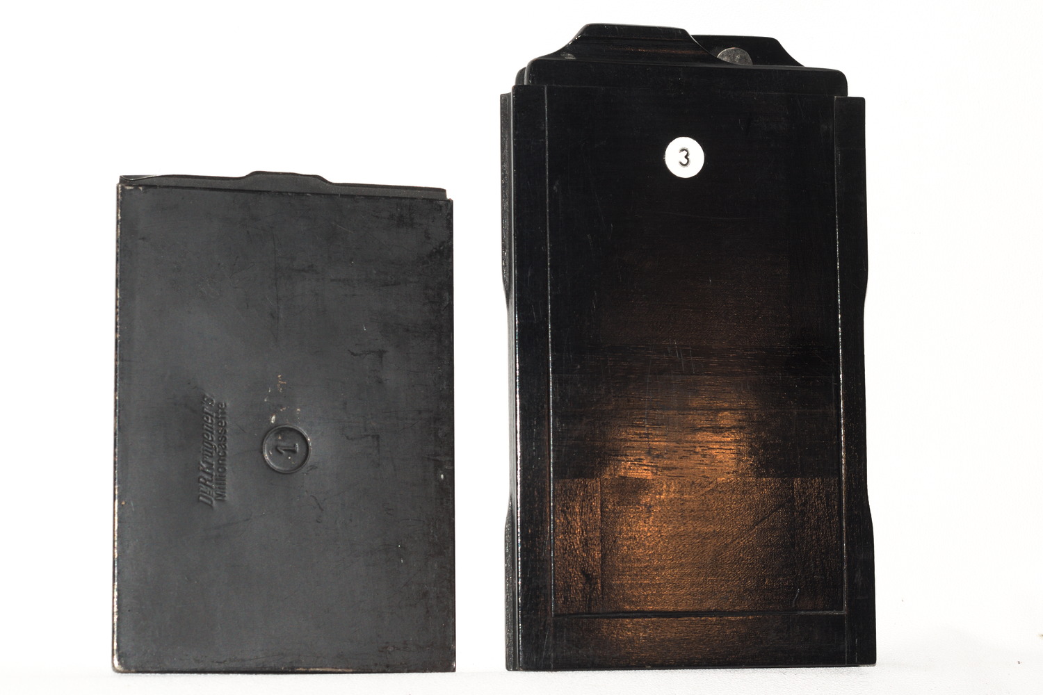 Es hat sich also herausgestellt, daß Kassetten mit Millionfalz in Holz bzw. Metall jeweils in üblicher Größe für 9x12 passen, nicht jedoch anfangs passend erscheinende von Rietschel/Agfa.