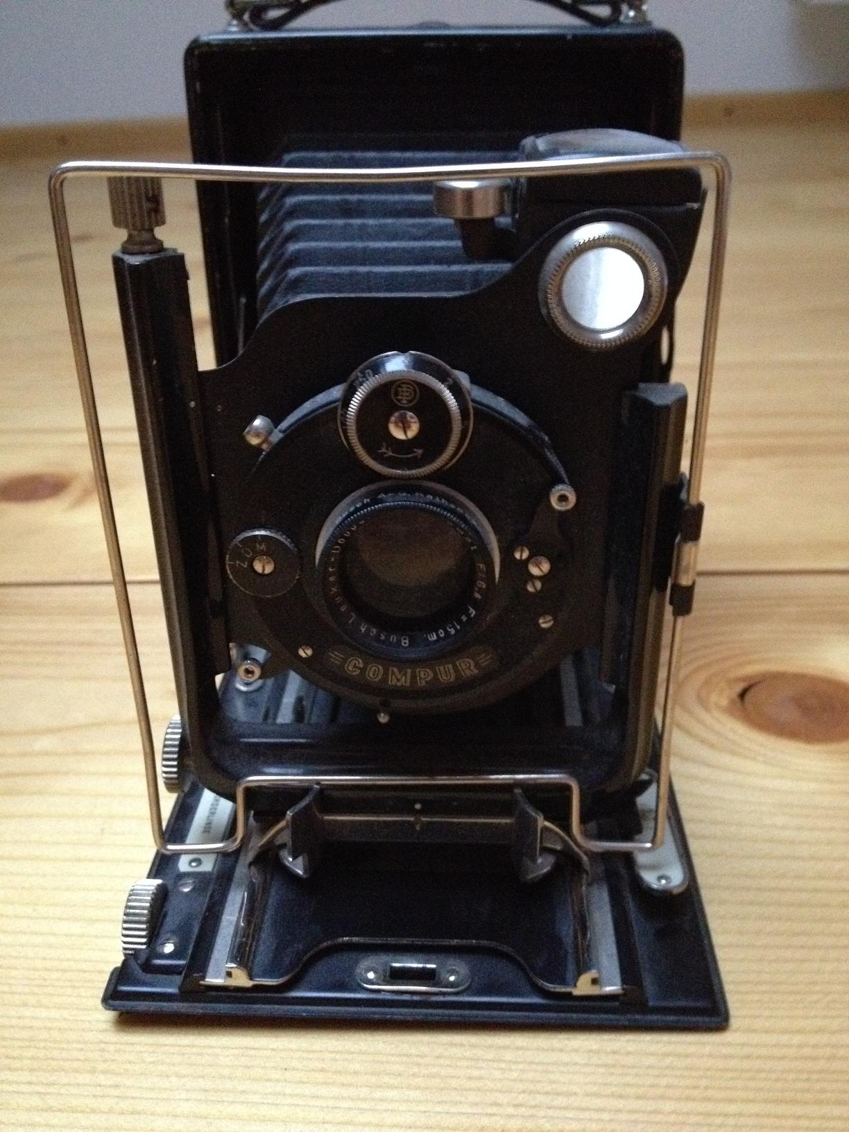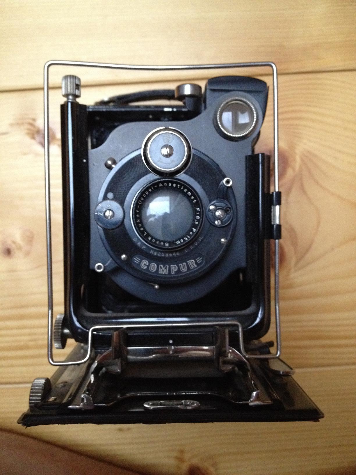 Meine Kameragehäuse ist jedoch aus Metall sehr massiv und schwer gefertigt, die Mattscheibenrückwand ist sogar aus dem Vollen gefräst! Im Compur hängt ein Busch Leukar-Doppel Anastigmat 6,8/150 daher vermute ich auch dass die Kamera von Emil Busch unter eigenem Namen vertrieben wurde. Werde Sie die Tage mal reinigen und hier nochmal vorstellen (mit Gewicht).