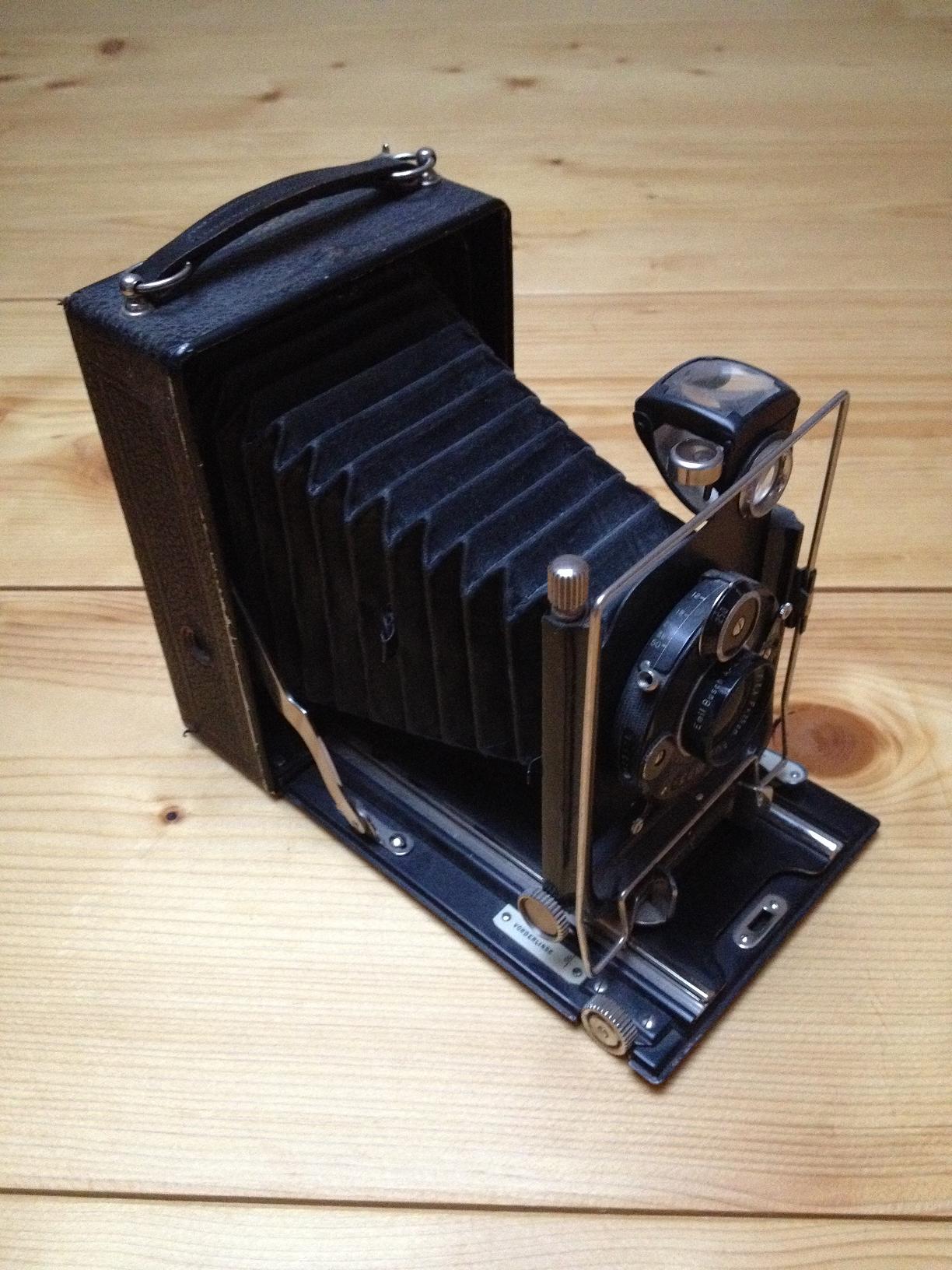 Habe mir die Kamera noch genauer mit meinen verglichen. Ich vermute, daß es sich um eine von Hoh&Hahne gebaute Welta handelt (die meisten Weltas sind nicht als solche gekennzeichnet). Bis auf den Höhenverstellknopf sieht sie aus wie eine von mir, die mit Ausnahme des Welta-Logos baugleich ist zu einem von Hoh&Hahne gebauten Welta-Modell *) (selbes Objektiv "Welta Doppel-Anastigmat Eustigmat 6.8/13.5"). Das Rückteil ist allerdings aus Holz (aber Rückteile und Objektive sind leicht austauschbar, und auch fabrikneu nicht unbedingt gleich). Das Modell sieht auch aus wie Welta, unterscheidet sich jedoch in manchen Details von den meisten Weltas. Leider fehlen die "Insignien" Welta (und/oder möglicherweise auch Porst), ansonsten ist es durchaus gesucht.