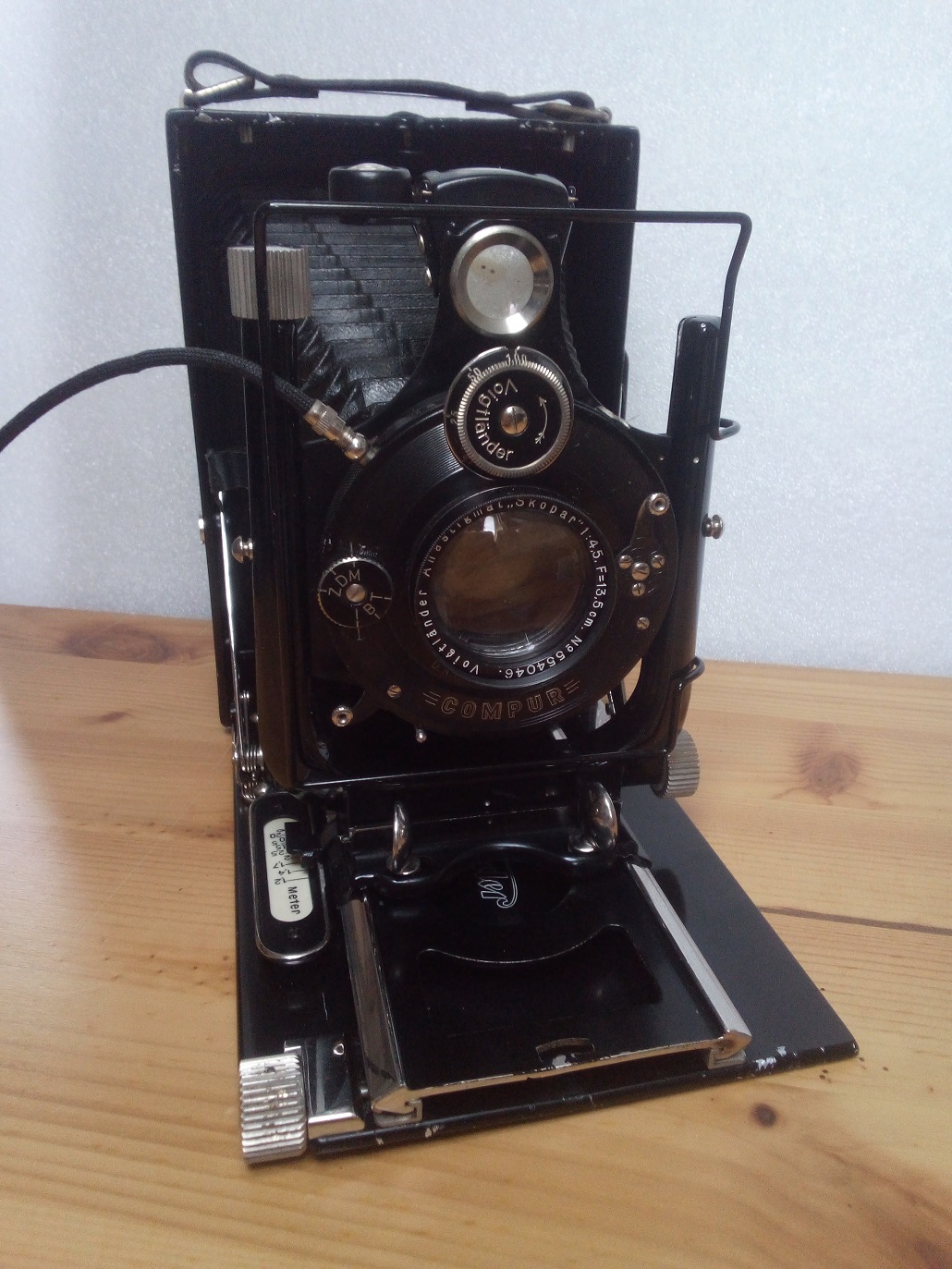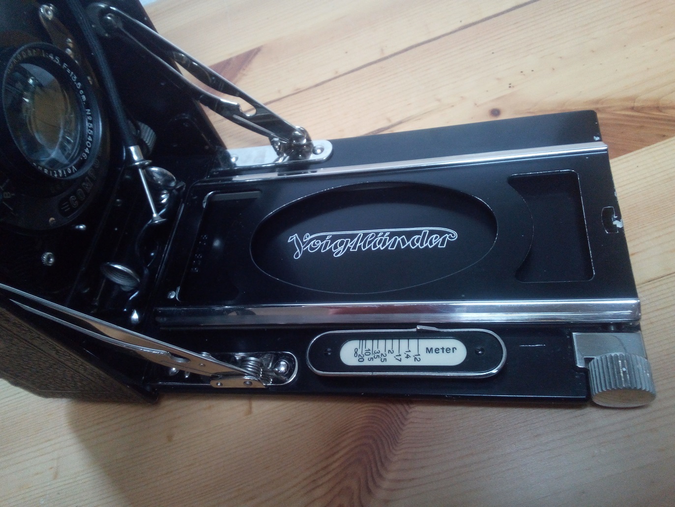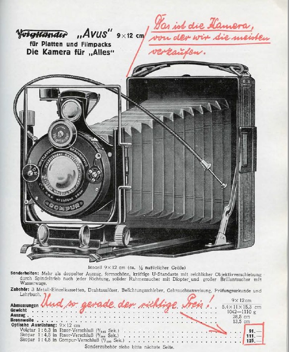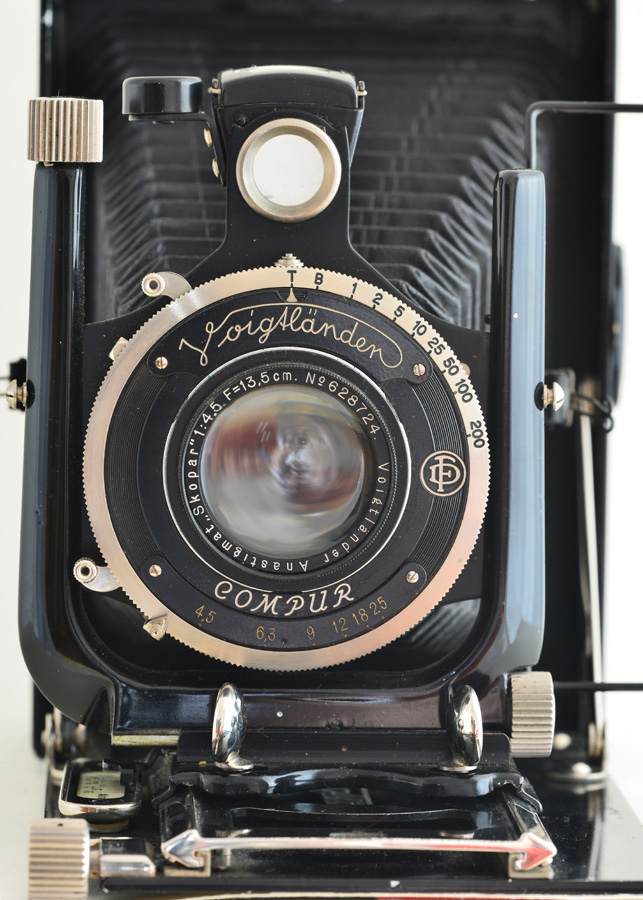 Das Objektiv läßt sich horizontal und vertikal verschwenken mit den großen Rändelschrauben an der Standarte. Die Meterskala reicht von Unendlich bis 1,2m, mit zusätzlichem Auszug liegt die Nahgrenze bei 20 cm. Die Belichtung steuert ein Compurverschluß mit T- und B-Einstellung uns Zeiten von 1s bis 1/200s. Der Voigtländer-Anastigmat hat eine Brennweite von 135 mm und eine Lichtstärke von 4,5. Die kleinste Blendenöffnung ist 25. Bildformat ist 9x12 cm - ein AGFA Film-Pack Kassette mit Agfa-Normalfalz ist ebenfalls vorhanden. Dazu noch verschiedene Belichtungstabellen und ein kurze Beschreibung.