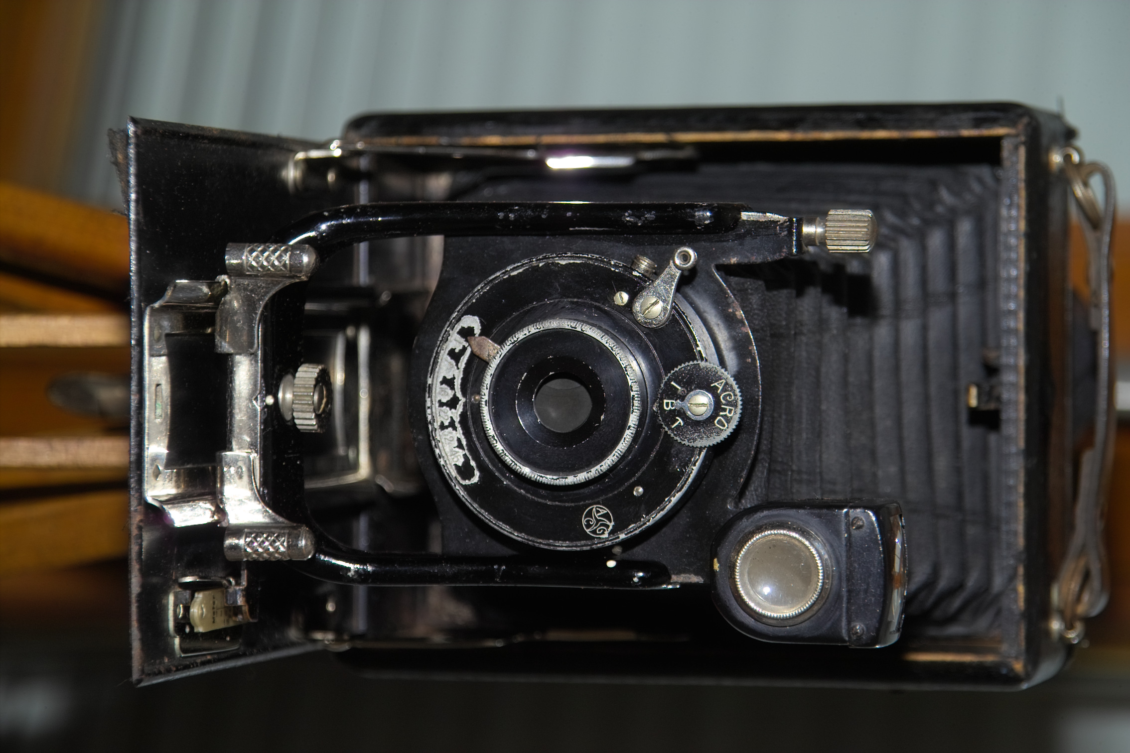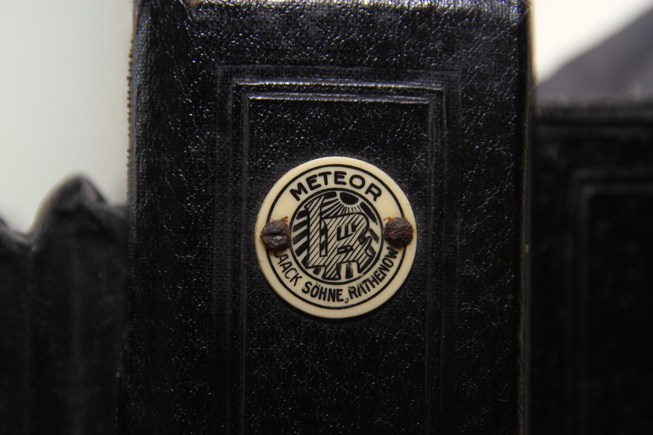 Ich hab leider vergessen Bilder vom Vorzustand zu machen, da war mein Arbeitseifer einfach zu groß. Erste Bestandsaufnahme ergab dass das gute Stück in Auflösung begriffen war. Die Leimungen der Belederung - vor Allem am Faltlichtschacht - waren nur noch rudimentär vorhanden. Der Balg hatte sich vom Gehäuse gelöst und die Standarte hat sich auf Grund einer gebrochenen Niete eines der Klemmgriffe komplett aus der Schiene herausgeschoben. Wenigstens der Verschluss verrichtete nach wie vor auf allen der drei Einstellungen seinen Dienst, wenn auch mit einem leisen sandigen Knirschen begleitet und etwas zaghaft. Aber zu meinem Glück - wieso sollte ich auch mal Glück bei Blenden haben - hat sich eine Lamelle gelöst und bewegte sich nicht mit. Erfreulich hingegen war dass das Herstellerschild die Kamera als eine Meteor von Laack in Rathenow identifizierte.