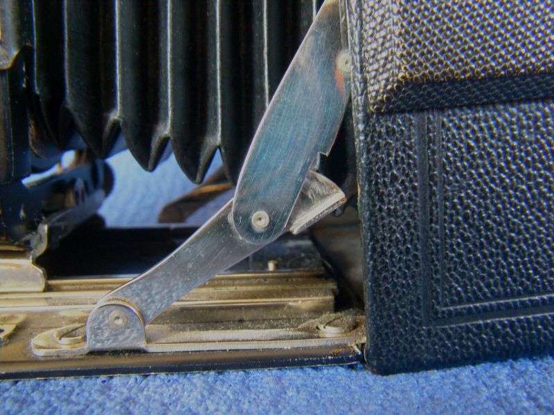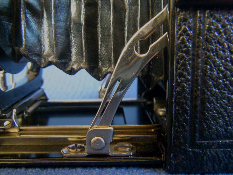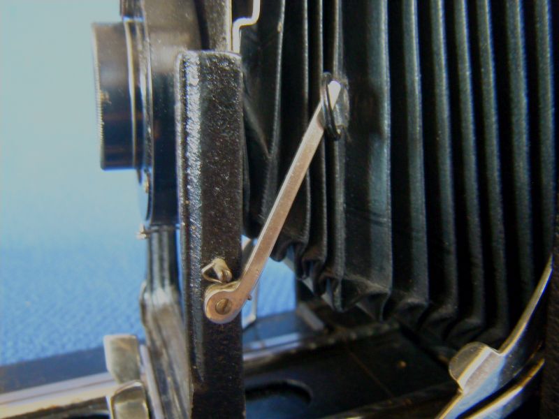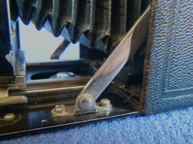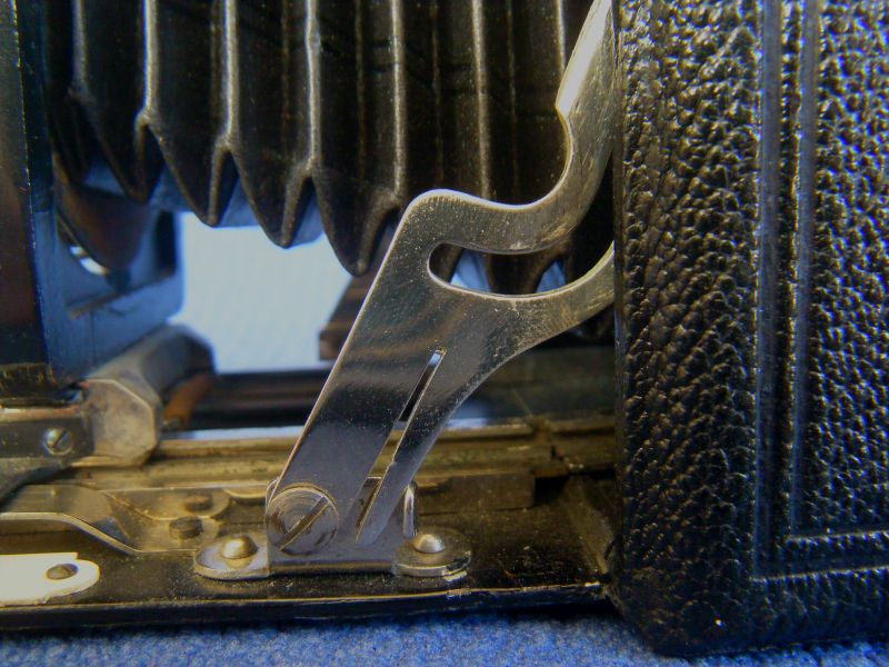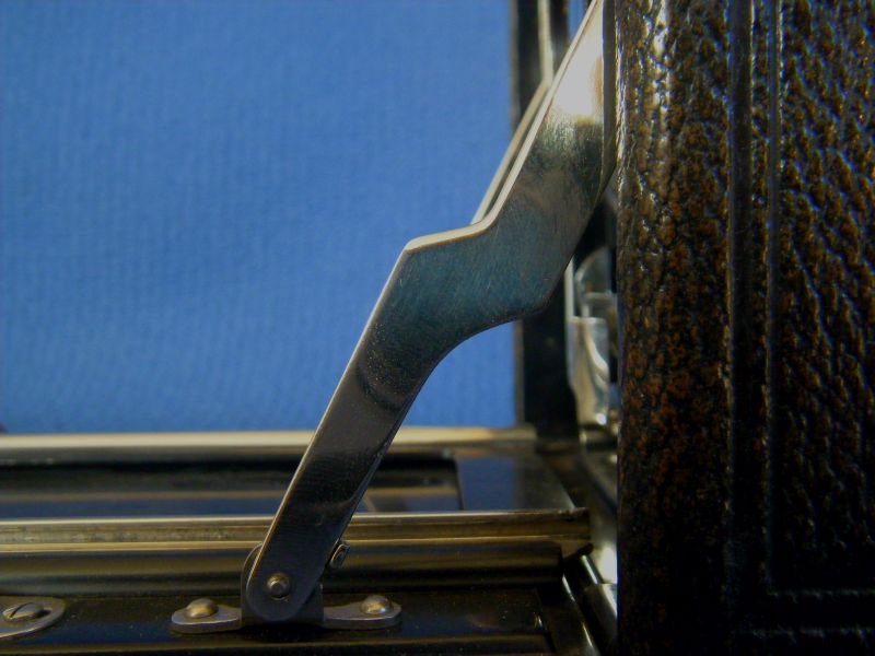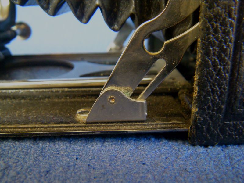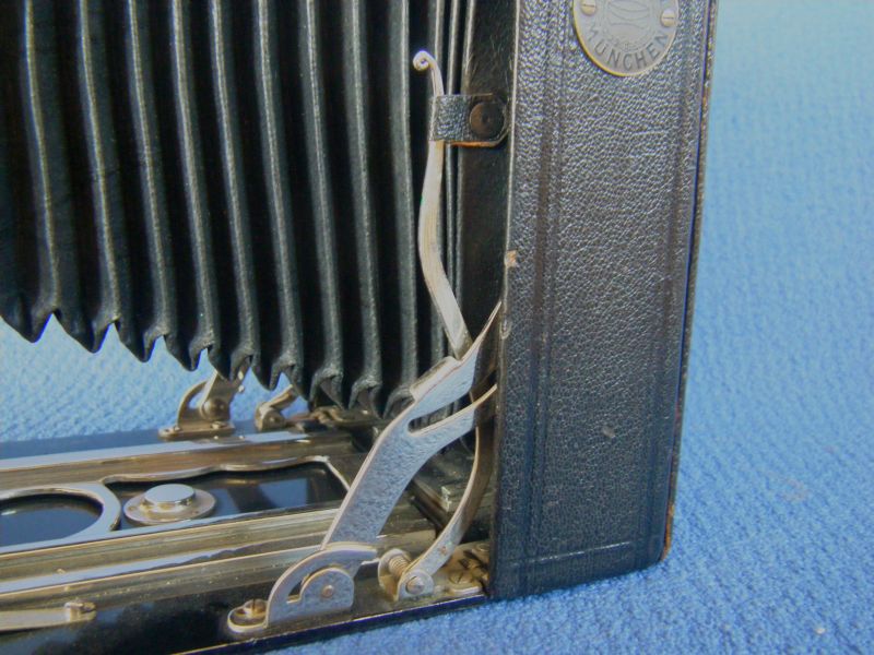 Kochmann Enolde Plattenkameras sind relativ leicht zu identifizieren, denn sie sind die Einzigen mit einer dornartig nach unten zeigenden Speizenfeder an der Spreize: (Enolde 6,5x9, Friedrich Corygon Anastigmat 6,3/12cm in Foth-Verschluss)