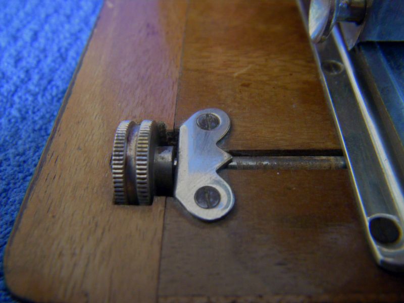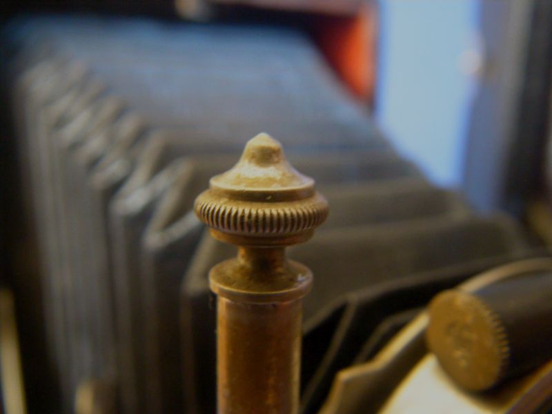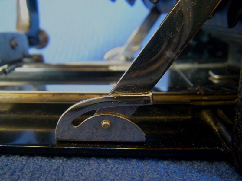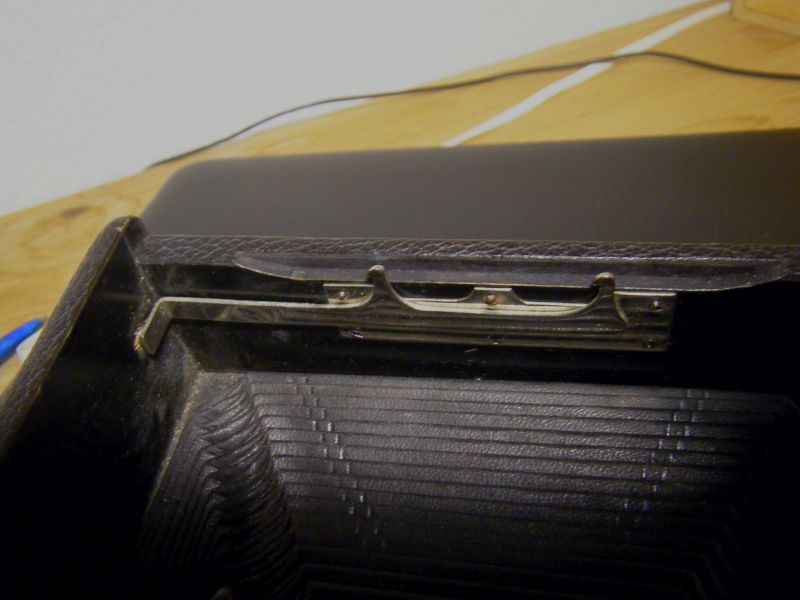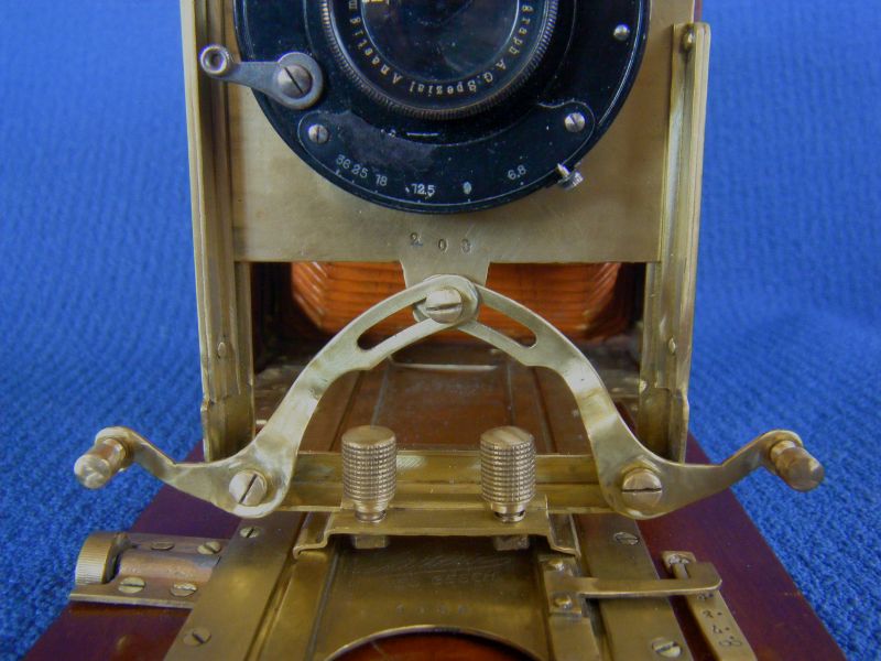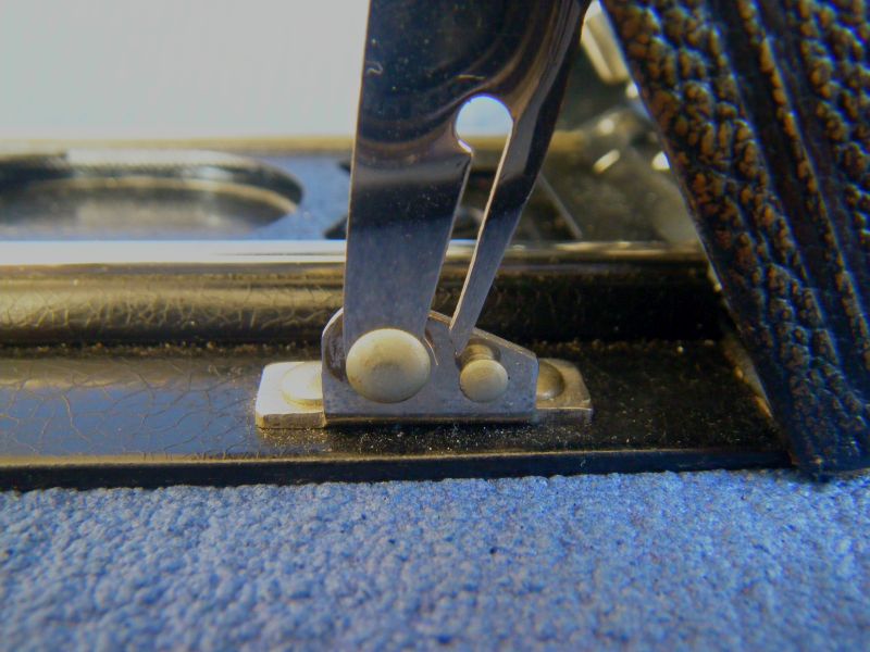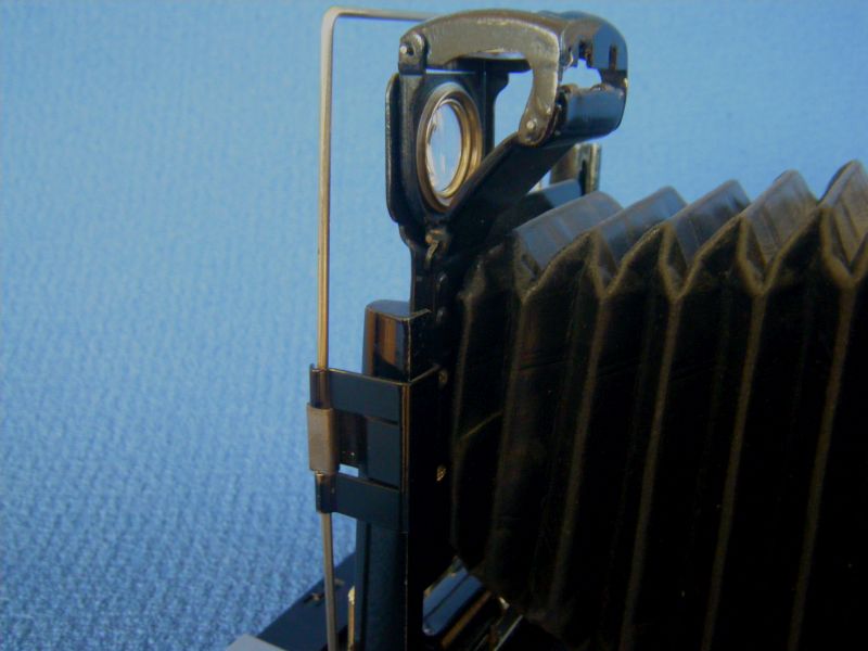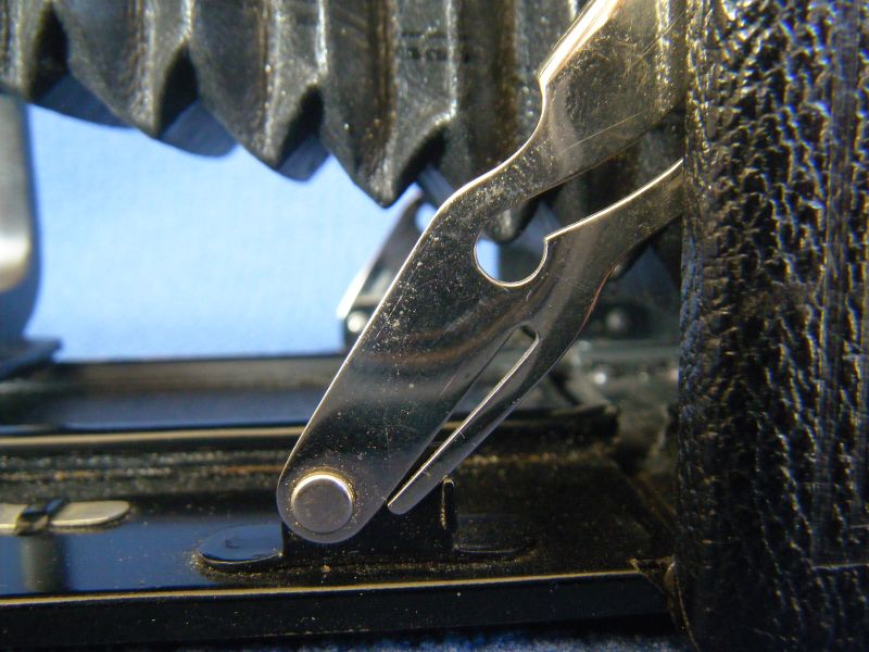 Kochmann Enolde Plattenkameras sind relativ leicht zu identifizieren, denn sie sind die Einzigen mit einer dornartig nach unten zeigenden Speizenfeder an der Spreize: (Enolde 6,5x9, Friedrich Corygon Anastigmat 6,3/12cm in Foth-Verschluss)