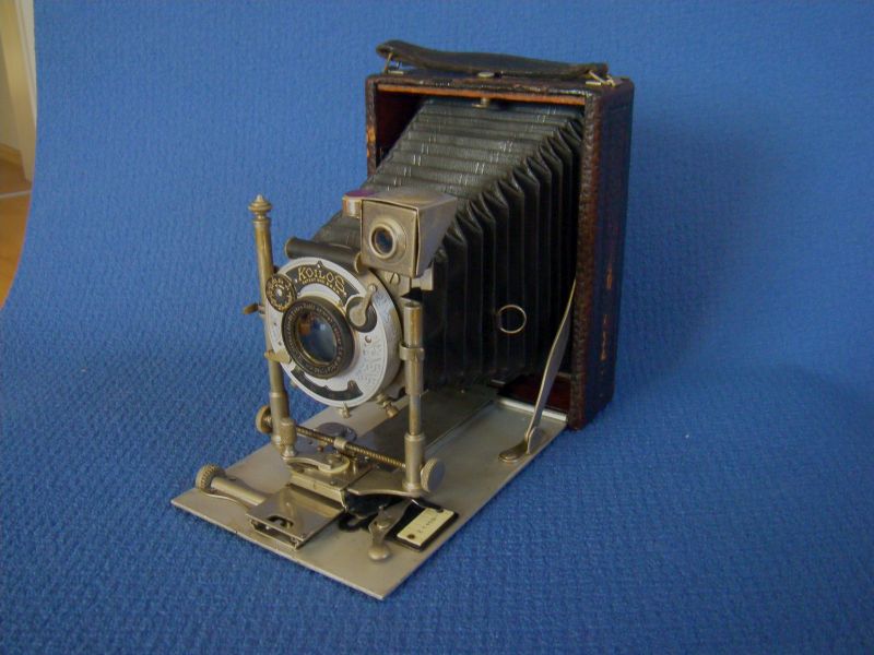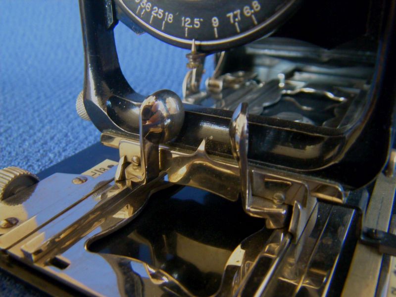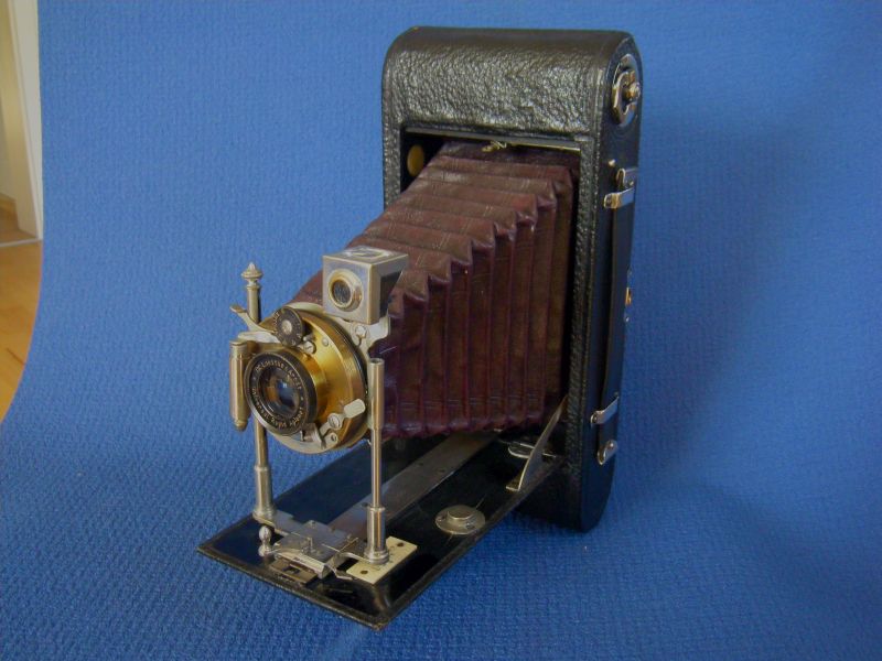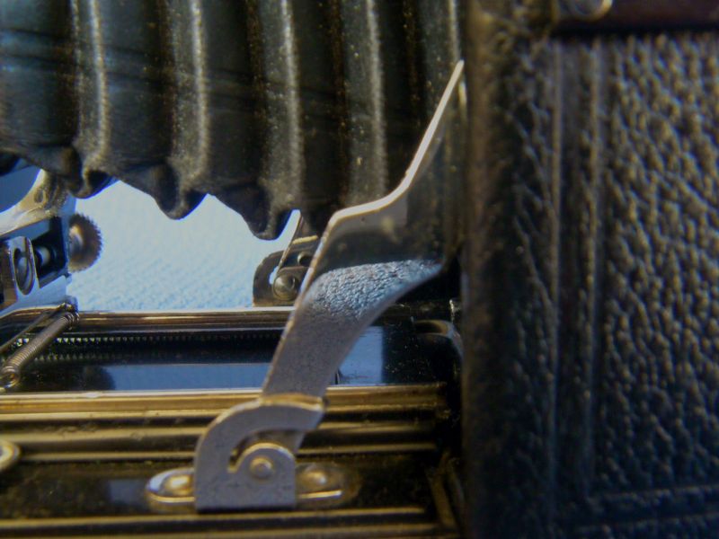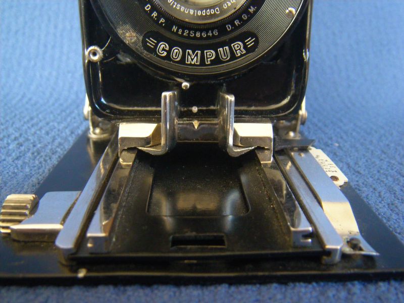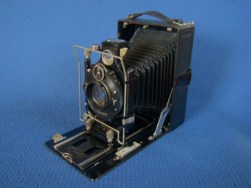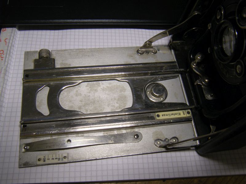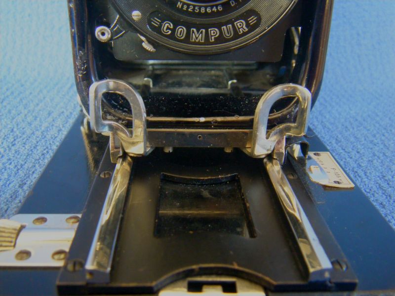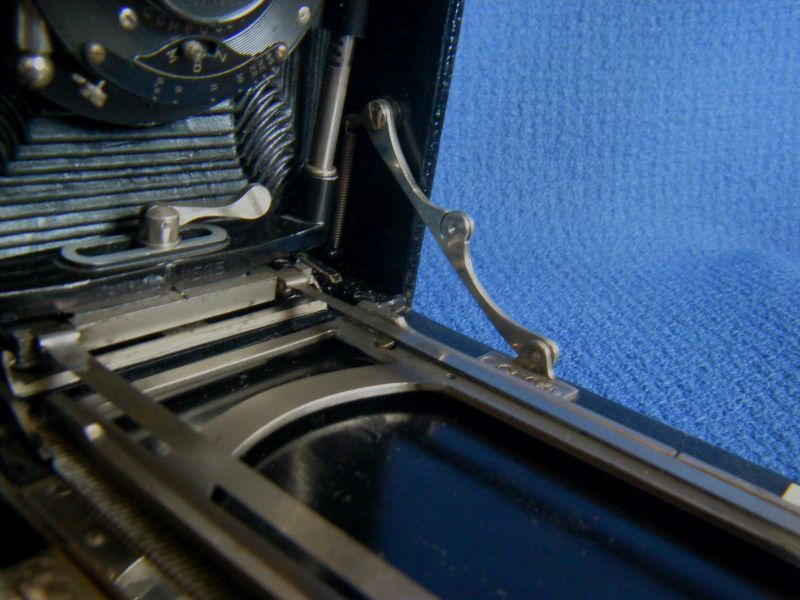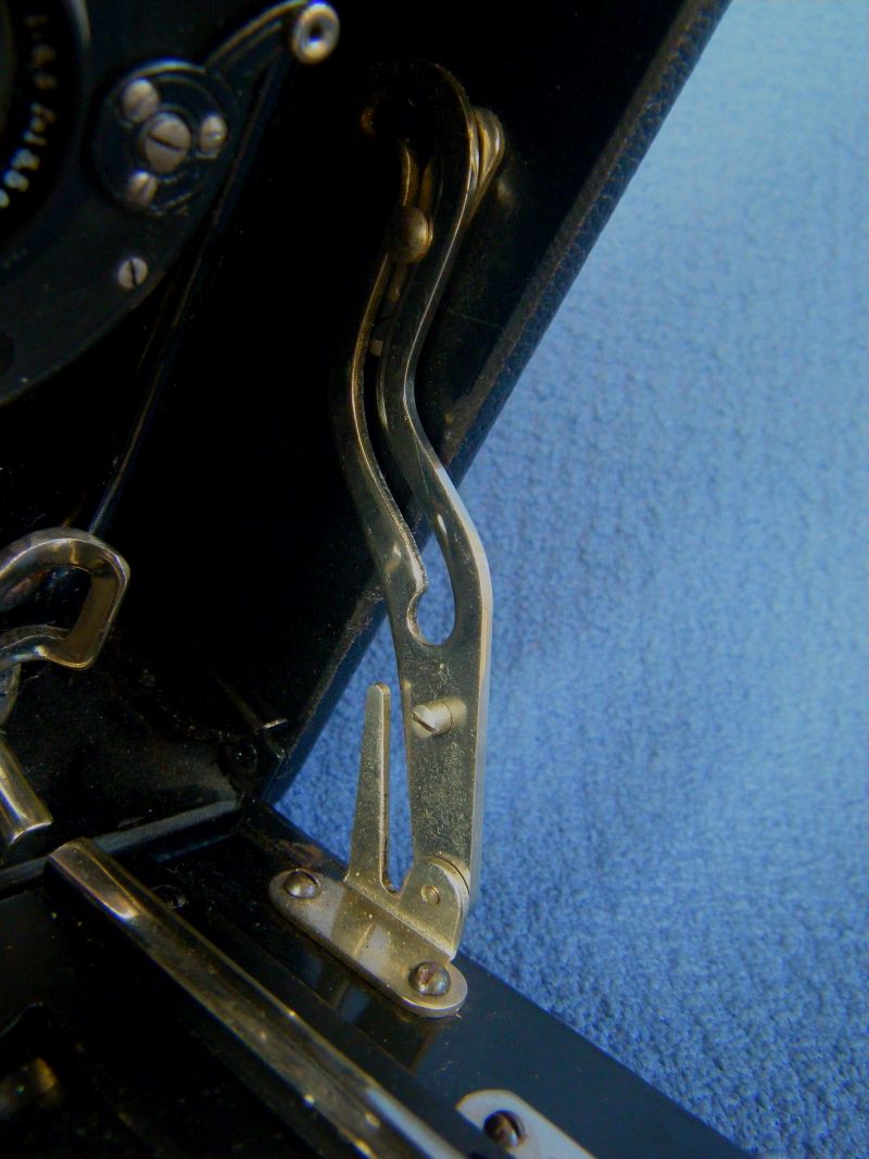 Goerz Autofok (im englischsprachigen Raum einfach Pocket-Tenax genannt). Das besondere der Kamera ist das automatische herausschnellen des Schlittens nach dem Öffnen der Kamera. Die technische Lösung ist kompliziert und störanfällig, hat sich ja auch nicht bewährt-wurde nicht weiterentwickelt. Vorne am Laufboden befindet sich ein Walze. In ihr befindet sich eine starke Feder. Auf der Walze aufgewickelt sind zwei Stahlbänder, die hin zu der Unterseite der U-Standarte führen. Beim Öffnen der Kamera wird der Schlitten entriegelt und mit einem "Wums" nach vorne in Aufnahmestellung befördert. Vor dem Einklappen des Laufbodens muss der Schlitten nach hinten ins Gehäuse geschoben werden und riegelt sich dort automatisch ein - die Feder in der Walze ist nun wieder für das nächste "Wums" gespannt. Das schönst an der Kamera sind aber die einzigartigen Knickspreizen - finde ich: