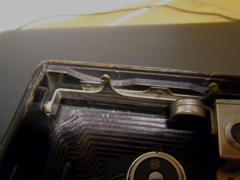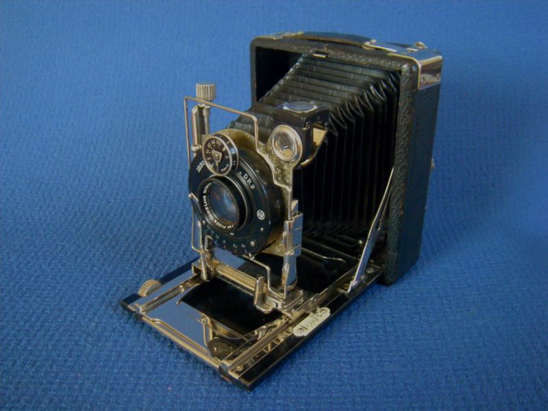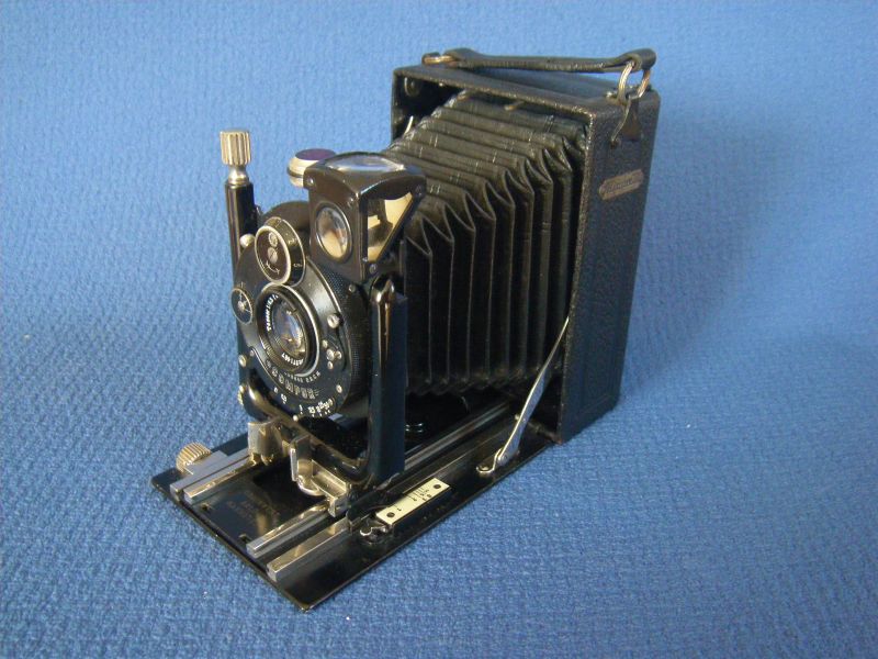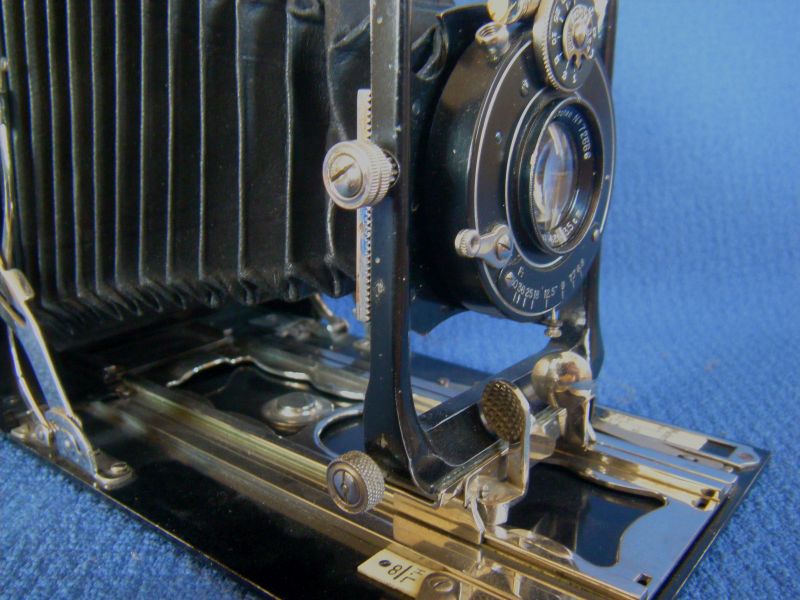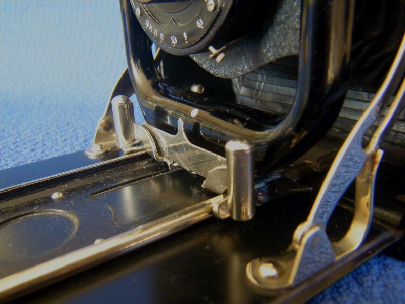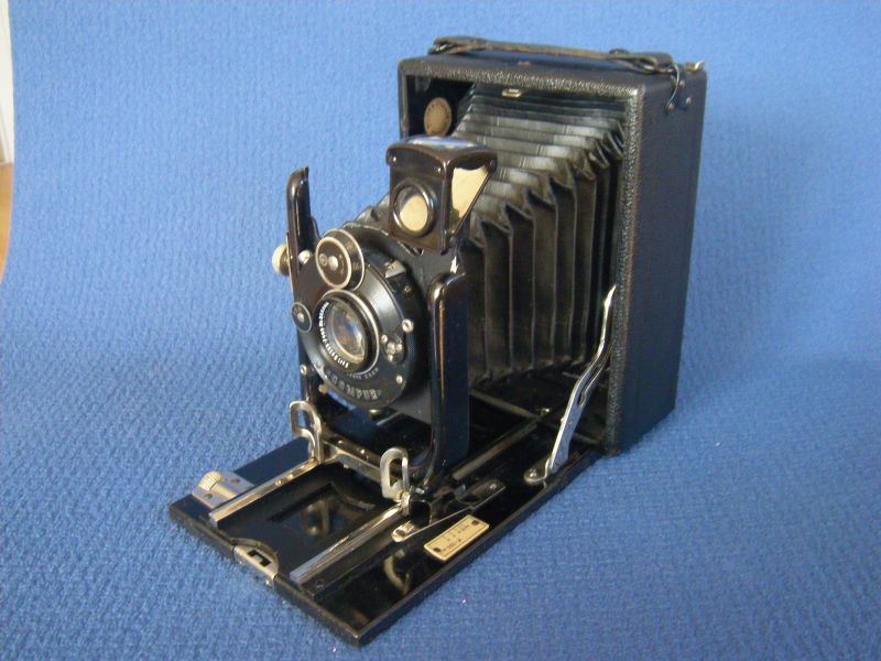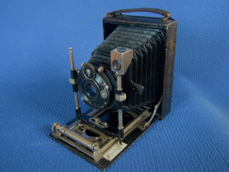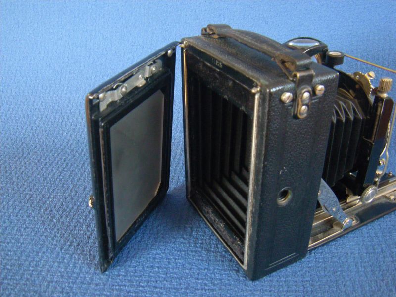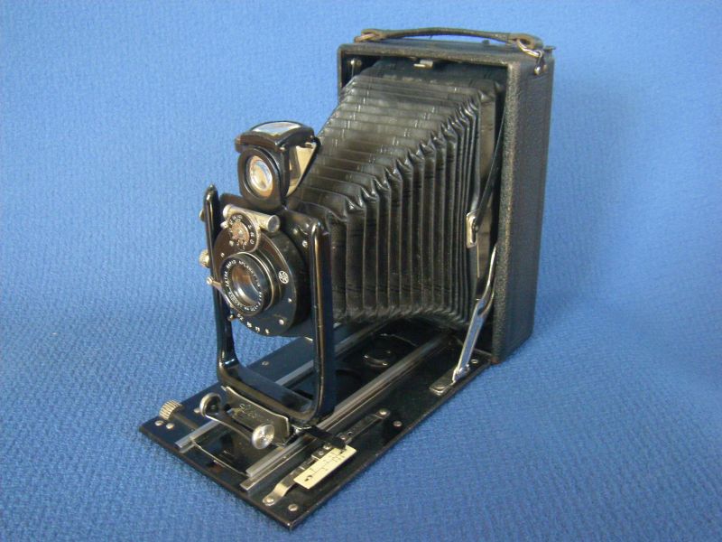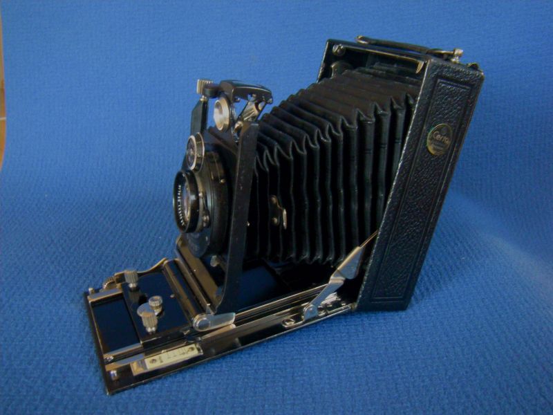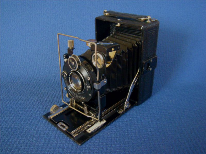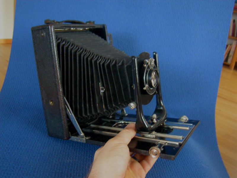 Goerz Autofok (im englischsprachigen Raum einfach Pocket-Tenax genannt). Das besondere der Kamera ist das automatische herausschnellen des Schlittens nach dem Öffnen der Kamera. Die technische Lösung ist kompliziert und störanfällig, hat sich ja auch nicht bewährt-wurde nicht weiterentwickelt. Vorne am Laufboden befindet sich ein Walze. In ihr befindet sich eine starke Feder. Auf der Walze aufgewickelt sind zwei Stahlbänder, die hin zu der Unterseite der U-Standarte führen. Beim Öffnen der Kamera wird der Schlitten entriegelt und mit einem "Wums" nach vorne in Aufnahmestellung befördert. Vor dem Einklappen des Laufbodens muss der Schlitten nach hinten ins Gehäuse geschoben werden und riegelt sich dort automatisch ein - die Feder in der Walze ist nun wieder für das nächste "Wums" gespannt. Das schönst an der Kamera sind aber die einzigartigen Knickspreizen - finde ich: