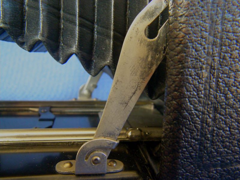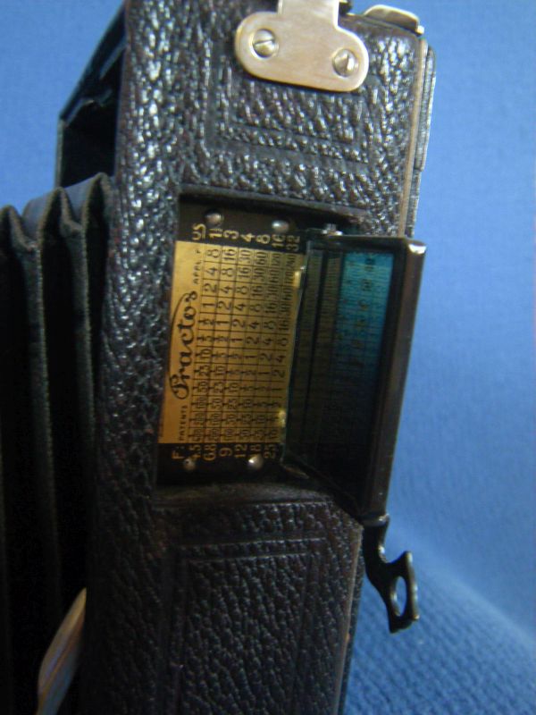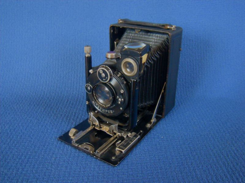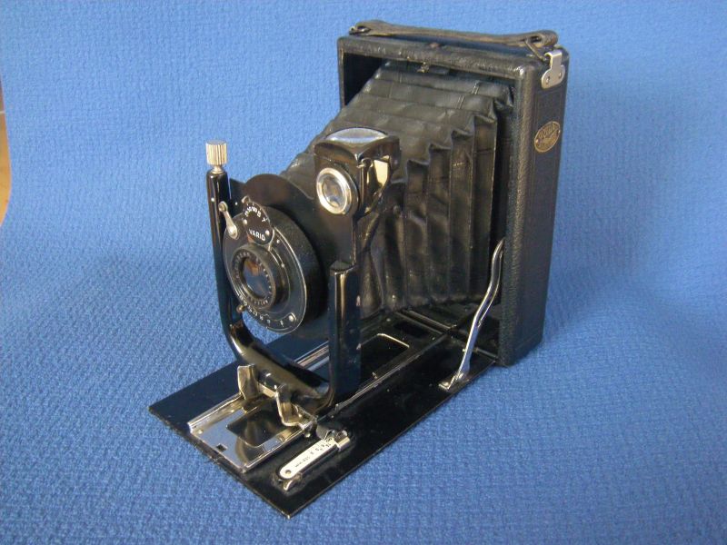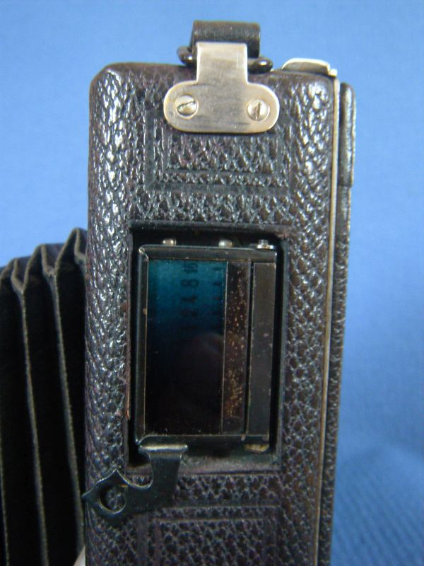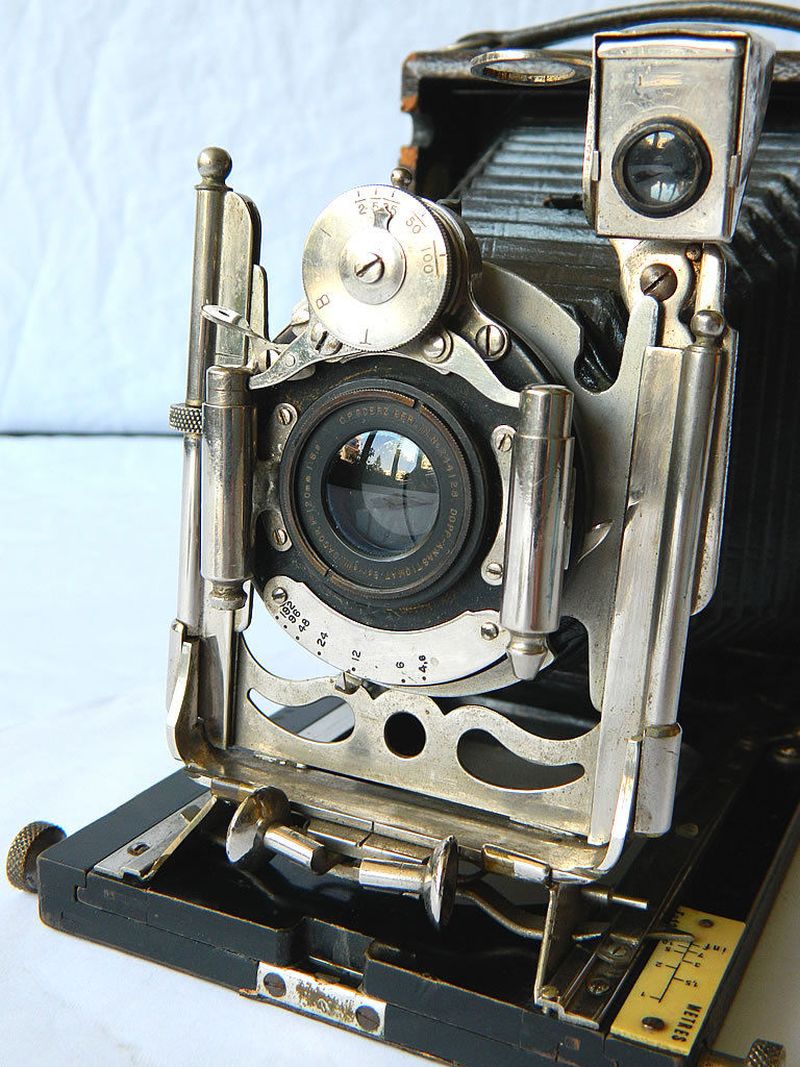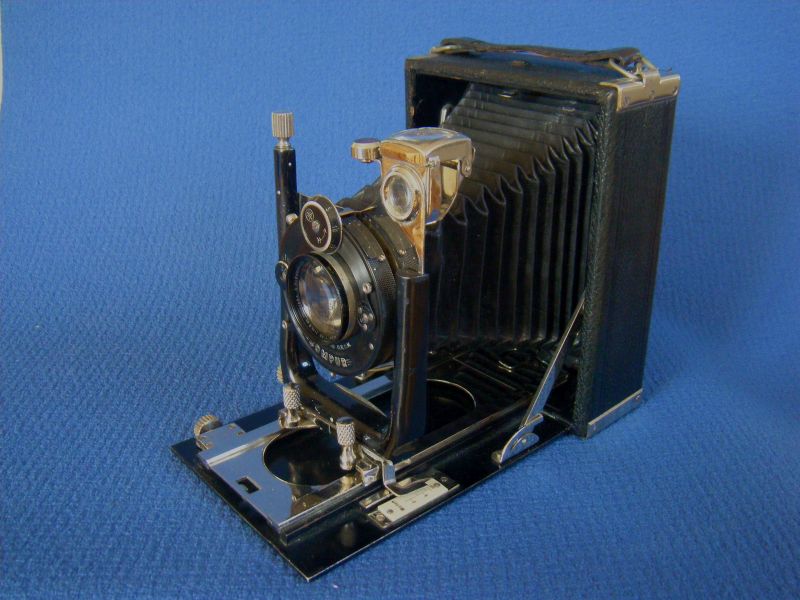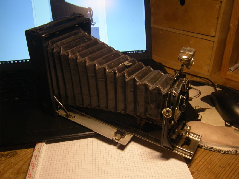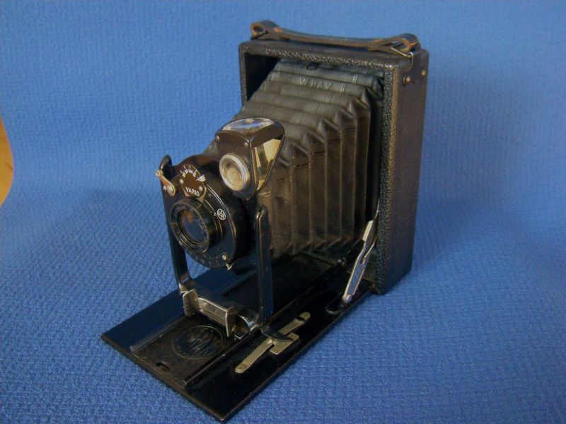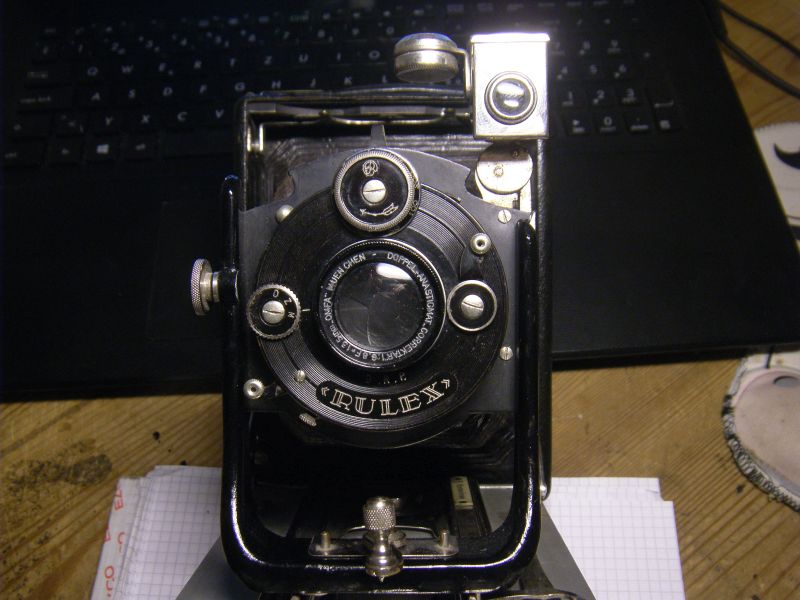 Goerz Autofok (im englischsprachigen Raum einfach Pocket-Tenax genannt). Das besondere der Kamera ist das automatische herausschnellen des Schlittens nach dem Öffnen der Kamera. Die technische Lösung ist kompliziert und störanfällig, hat sich ja auch nicht bewährt-wurde nicht weiterentwickelt. Vorne am Laufboden befindet sich ein Walze. In ihr befindet sich eine starke Feder. Auf der Walze aufgewickelt sind zwei Stahlbänder, die hin zu der Unterseite der U-Standarte führen. Beim Öffnen der Kamera wird der Schlitten entriegelt und mit einem "Wums" nach vorne in Aufnahmestellung befördert. Vor dem Einklappen des Laufbodens muss der Schlitten nach hinten ins Gehäuse geschoben werden und riegelt sich dort automatisch ein - die Feder in der Walze ist nun wieder für das nächste "Wums" gespannt. Das schönst an der Kamera sind aber die einzigartigen Knickspreizen - finde ich: