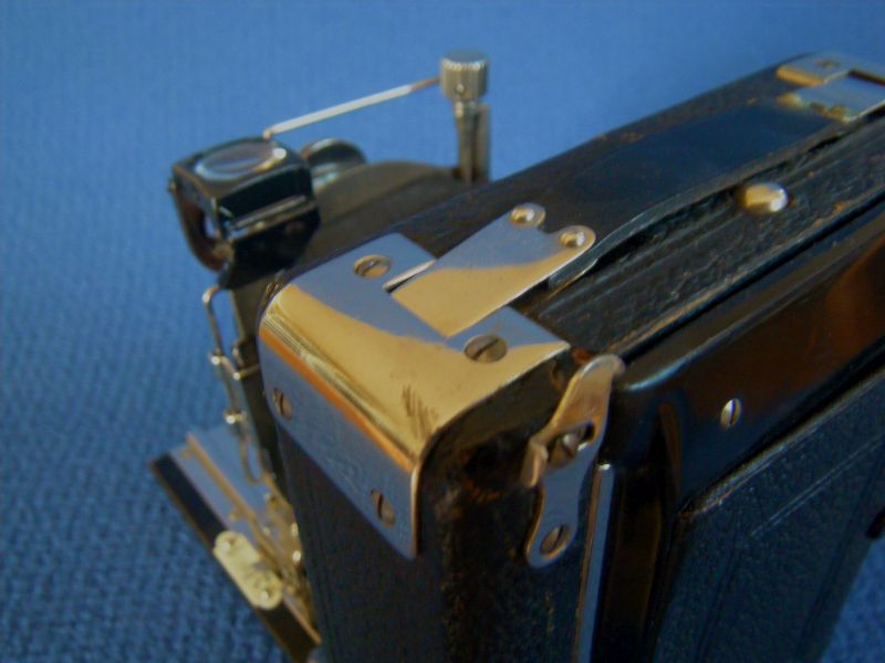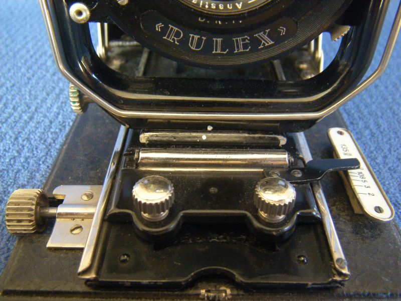 Nur ist meine kleiner, 9x12, hat ein OMFA-Dop.Anast. 6,8/13,5cm in Rulex: .... In Nahaufnahmen des Gehäuseverschlussmechanismus sieht man wie erstaunlich gleich diese, bei den auf den ersten Blick so unterschiedlichen Kameras sind: (Tauber 13x18) (OMFA 9x12)