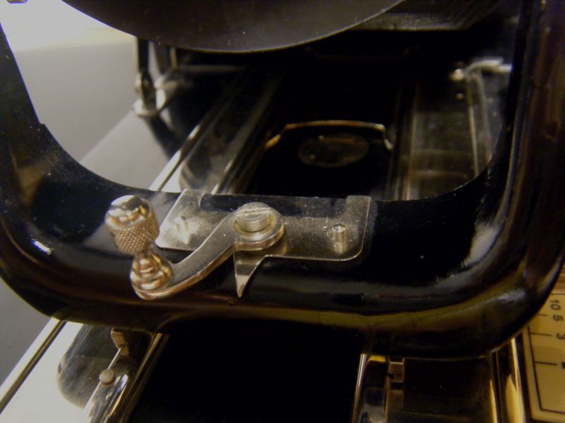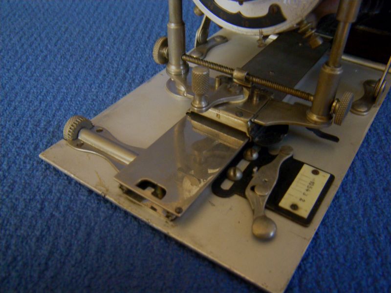 Erkennungszeichen sind u.a. die federnd, rechts und links, im Kastenförmigen Schlitten gelagerten, tellerförmige Handhabe-Knöpfe: