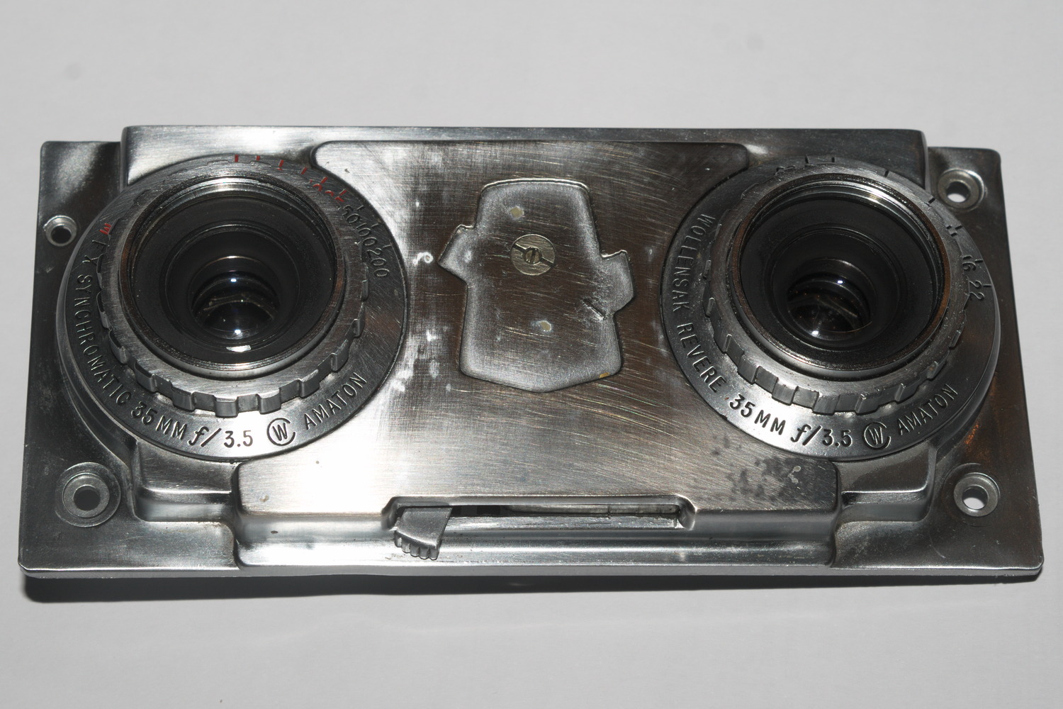 Texte und Firmenzeichen sind immer wieder verlorengegangen, z.B. nicht erkennbare Lederprägung, Plättchen mit Hersteller- und Modelldaten verblichen oder abgefallen. Selbst bei denselben Modellen desselben Herstellers waren Modellbezeichnungen mal hier, mal da; z.B. ICA Trona 210 - am Tragegriff oder am Kameragehäuse. Ein signifikanter Umriß eines verlorenen Markenzeichens sichert allenfalls Firmenverwandtschaft. Ich gehe jetzt für das mal kurz fremd zum Bereich KB : Beispiel: Wollensak oder Revere? Revere nach Übernahme durch Wollensak deren "selbständige" Billigmarke, beide hatten viele Identteile. Beispiel: die optische Einheit einer Wollensak- oder einer Revere-Stereokamera. Das Amaton war mögliche Ausstattung beider Marken. In die Aussparung in der Mitte passen alternativ das Wollensak- und Revere-Logo: