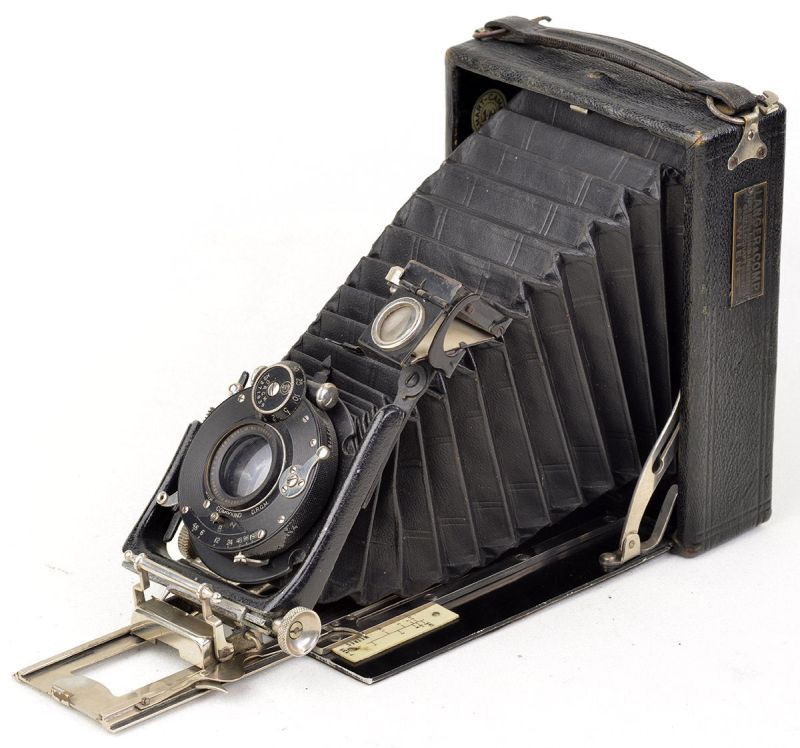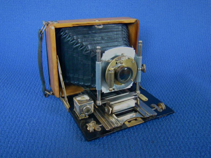 Und hier eine Laufbodenkamera von einem mir (noch) unbekannten Hersteller im Format 9x12, im Hoch-und Querformat ansetzbares Rückteil, senkbarer Laufboden, dreifacher Auszug, Goerz Dagor Serie III 6,8/150mm, Compound: