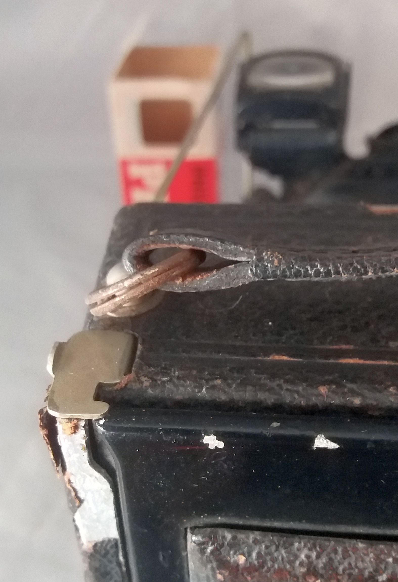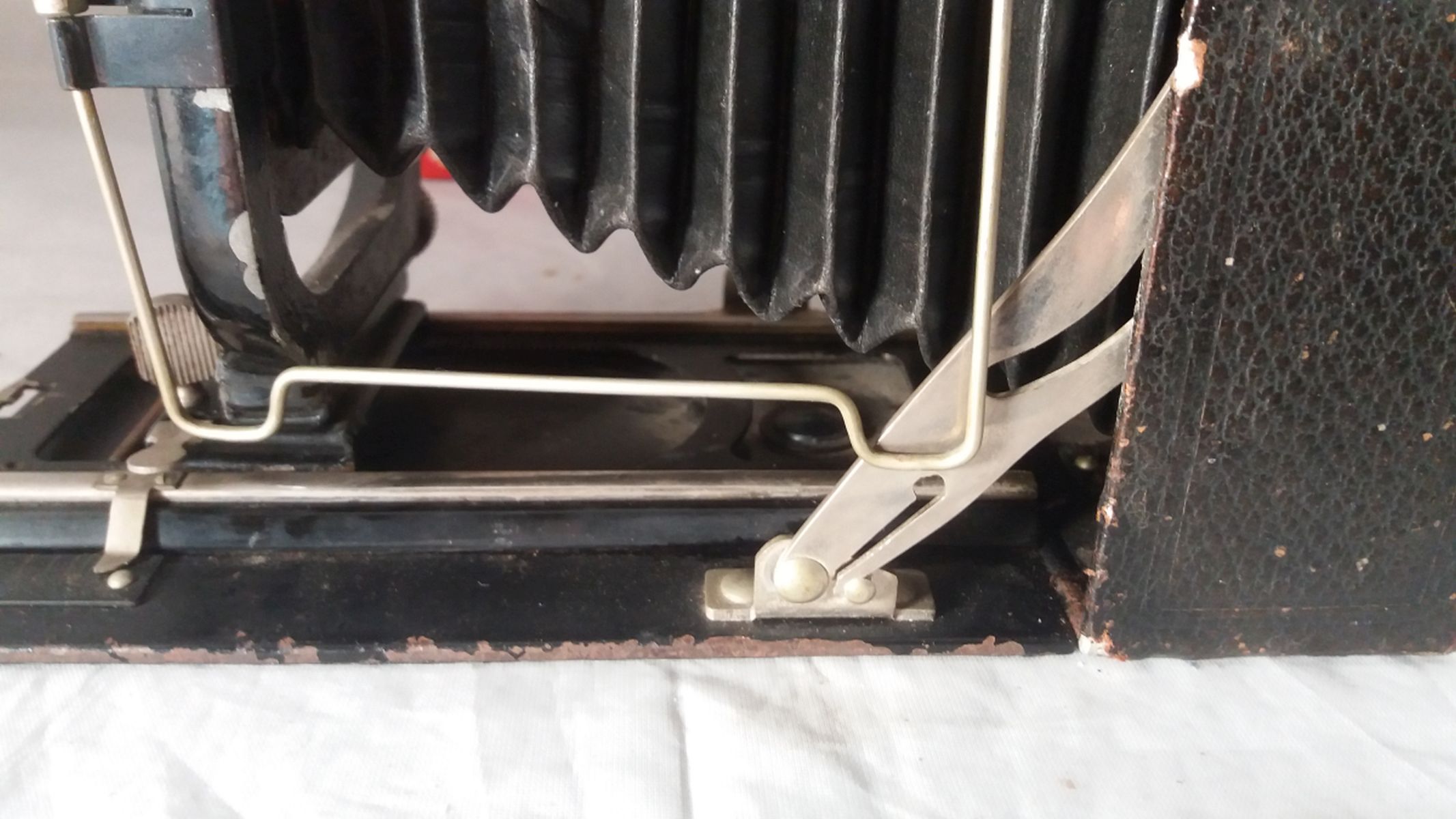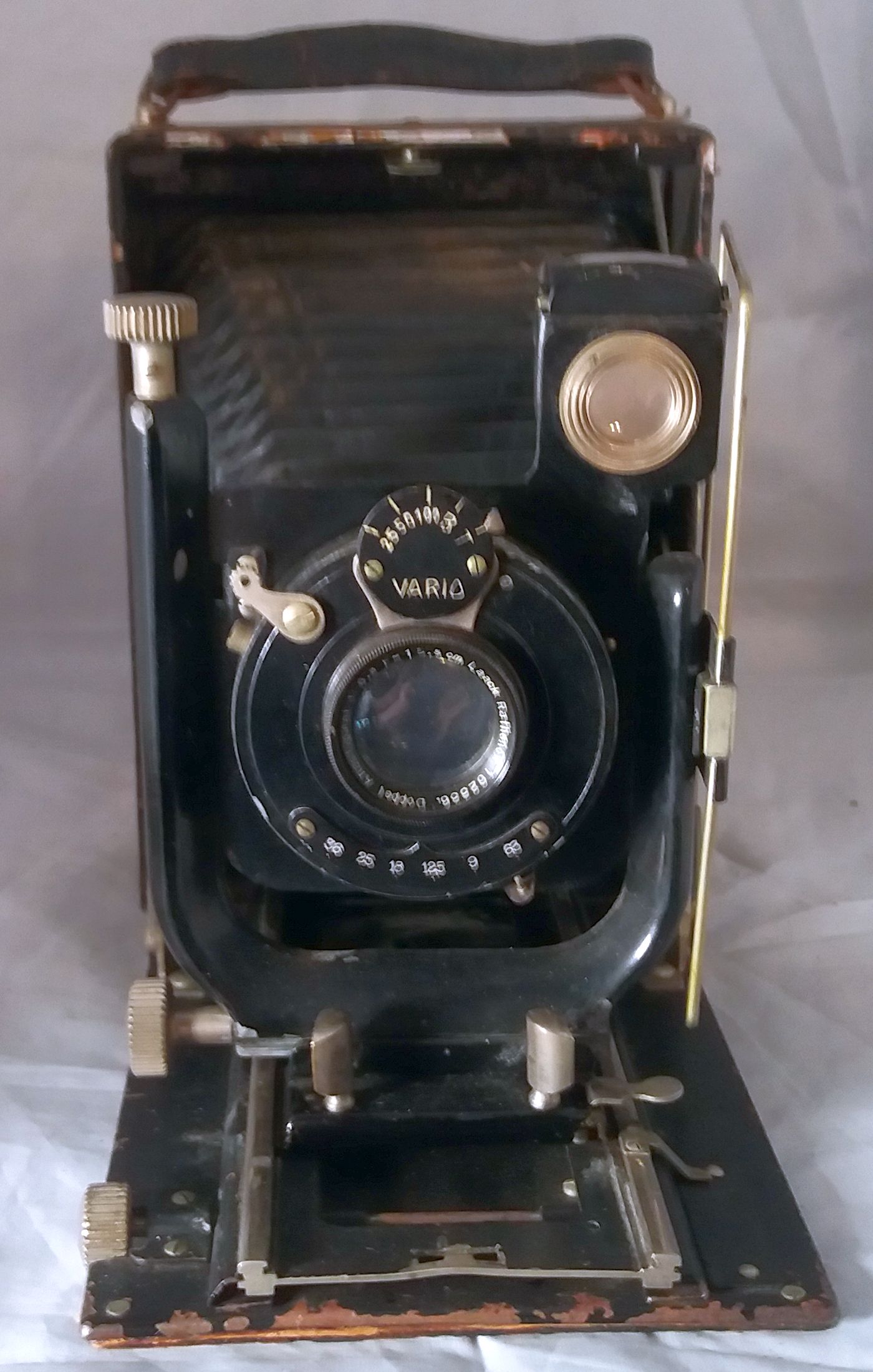 Hallo, kürzlich kam mit einem Konvolut diese, etwas lädierte, Laufbodenkamera zu mir. Näheres untersuchen zeigte dass sie zwar etwas abgeledert wirkt, aber bis auf den fehlenden Rahmensucher und eine leicht verbogene Einrastschiene ( sorry, ich weiß den richtigen Namen nicht, gemeint ist die Befestigung des Schlittens wenn die Kamera ganz zurückgeschoben wird), die Schiene war schnell in Ordnung gebracht, der Sucher ist eben leider weg,und die Generalüberholung wird dann wohl im Osterurlaub erfolgen, aber der Hersteller fehlt noch, anhand der Bilder im Tread über unbekannte Laufböden, würde ich vom Rückenteil und den Spreizen her auf Wirgin tippen, was denkt ihr?