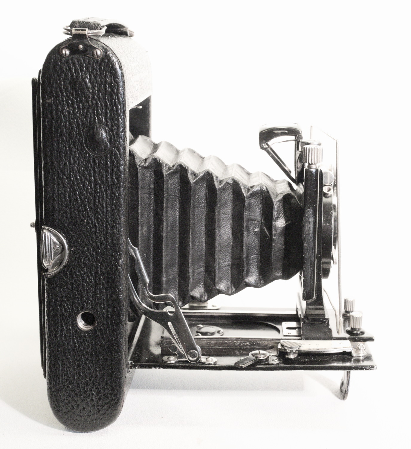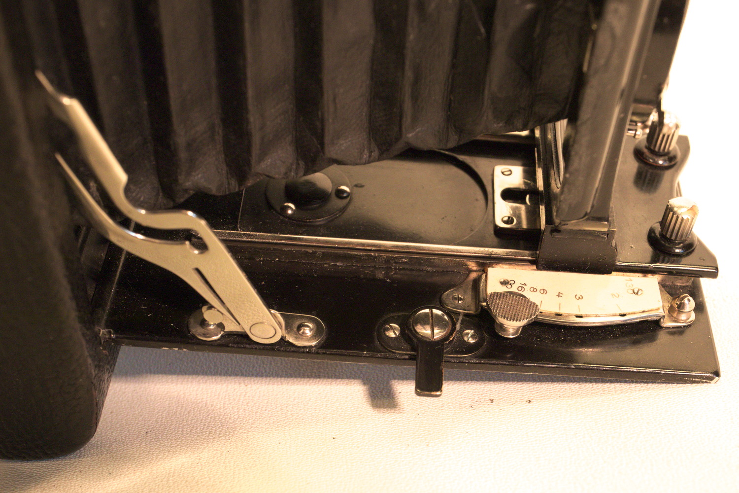 Eins (ist? nein:) war mir unklar - wozu dient der schwarze Hebel vorn Mitte (der mit dem Schattenwurf; man sieht ihn auch in anderen Bildern): ? Klappt man ihn aus, kann man die Kamera im Breitformat gerade auf einer ebenen Fläche (z.B. Tisch) aufstellen - es ist also ein Aufsteller für's Breitformat!