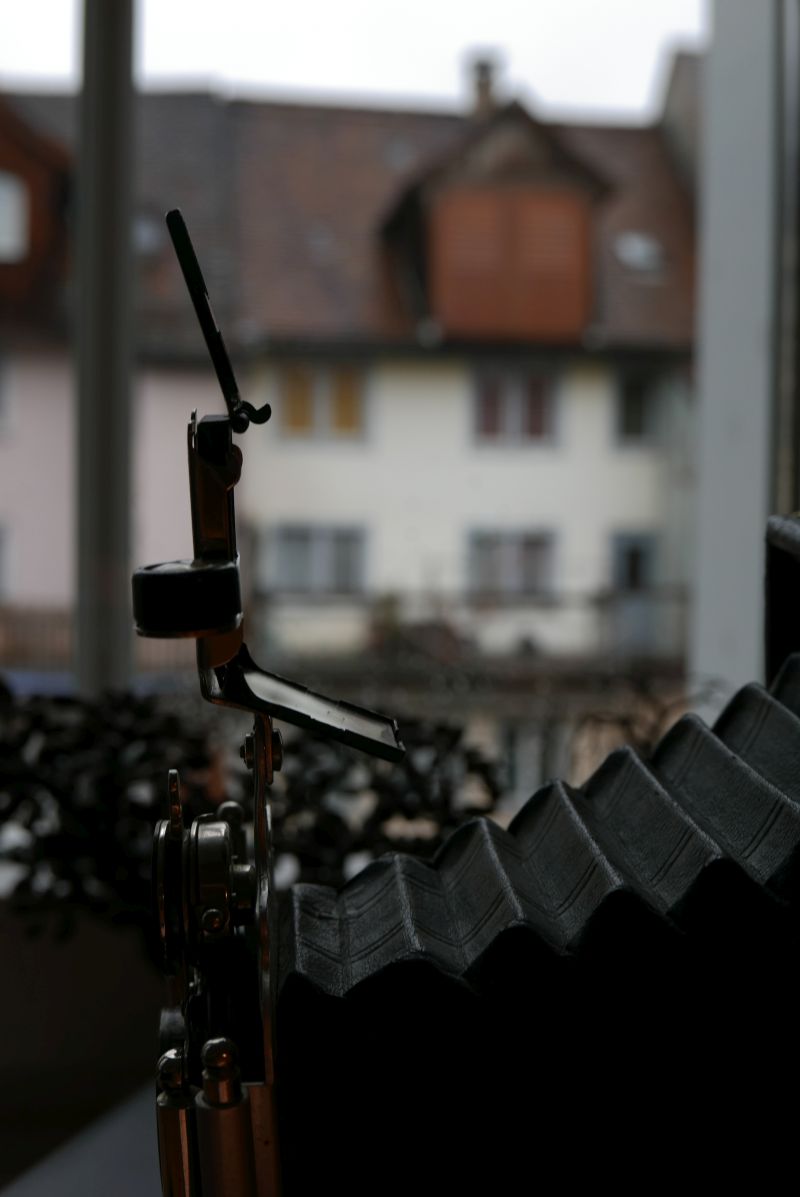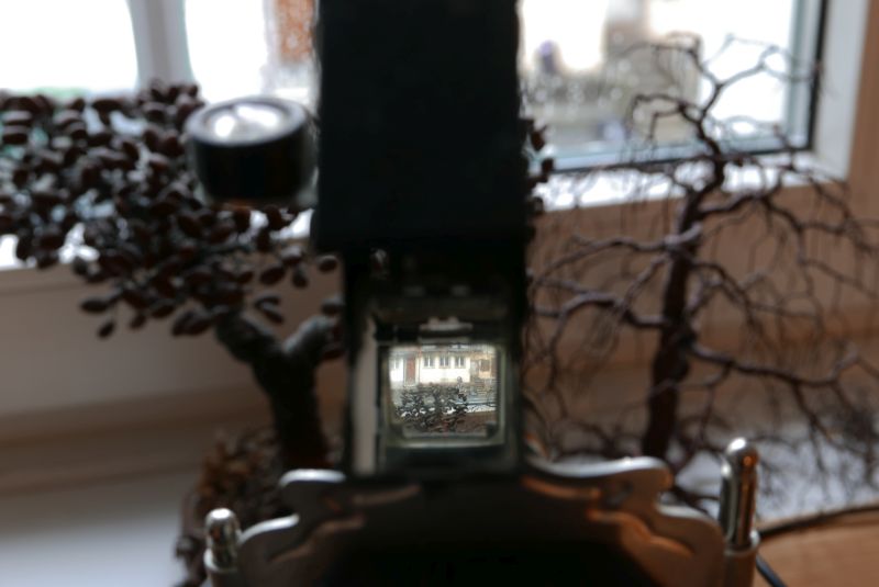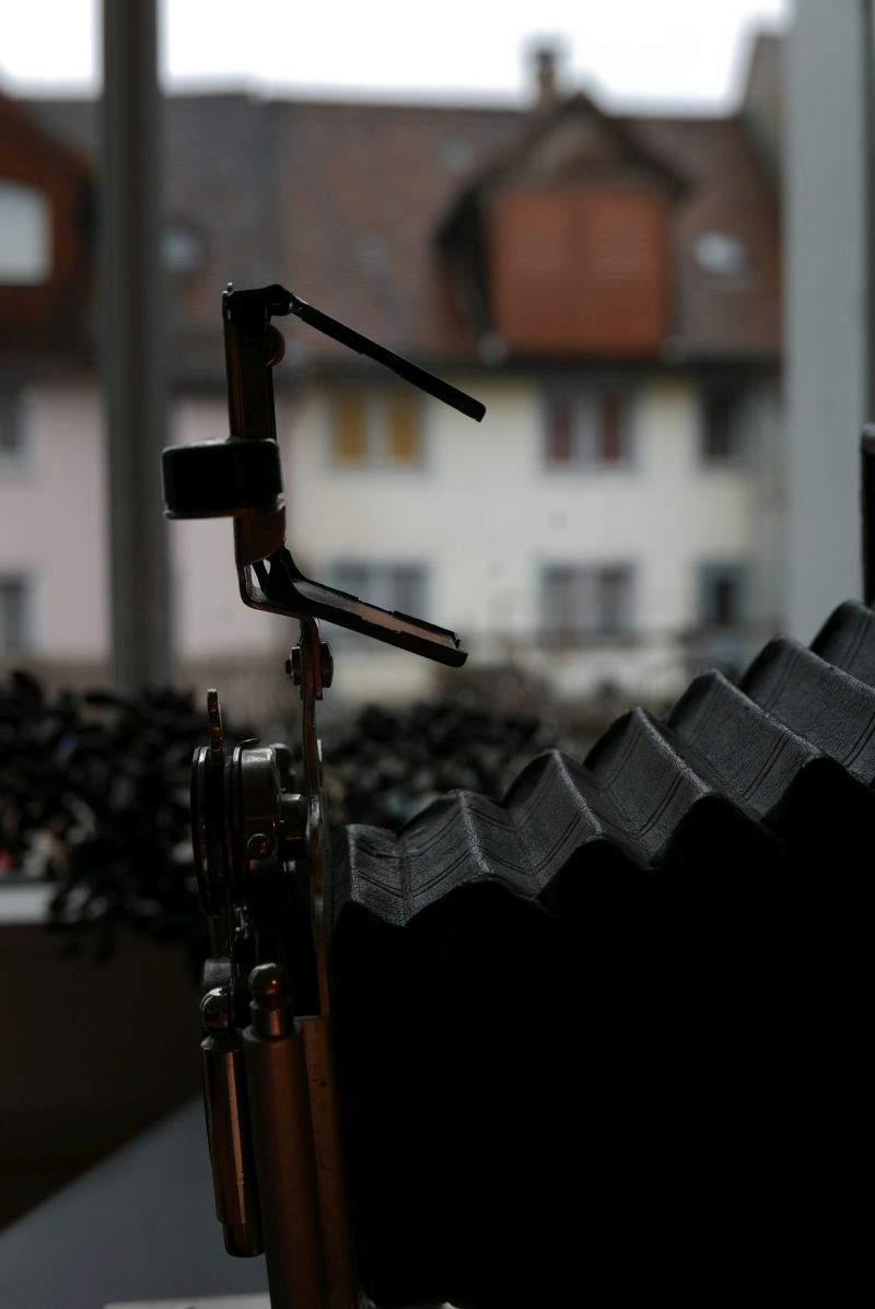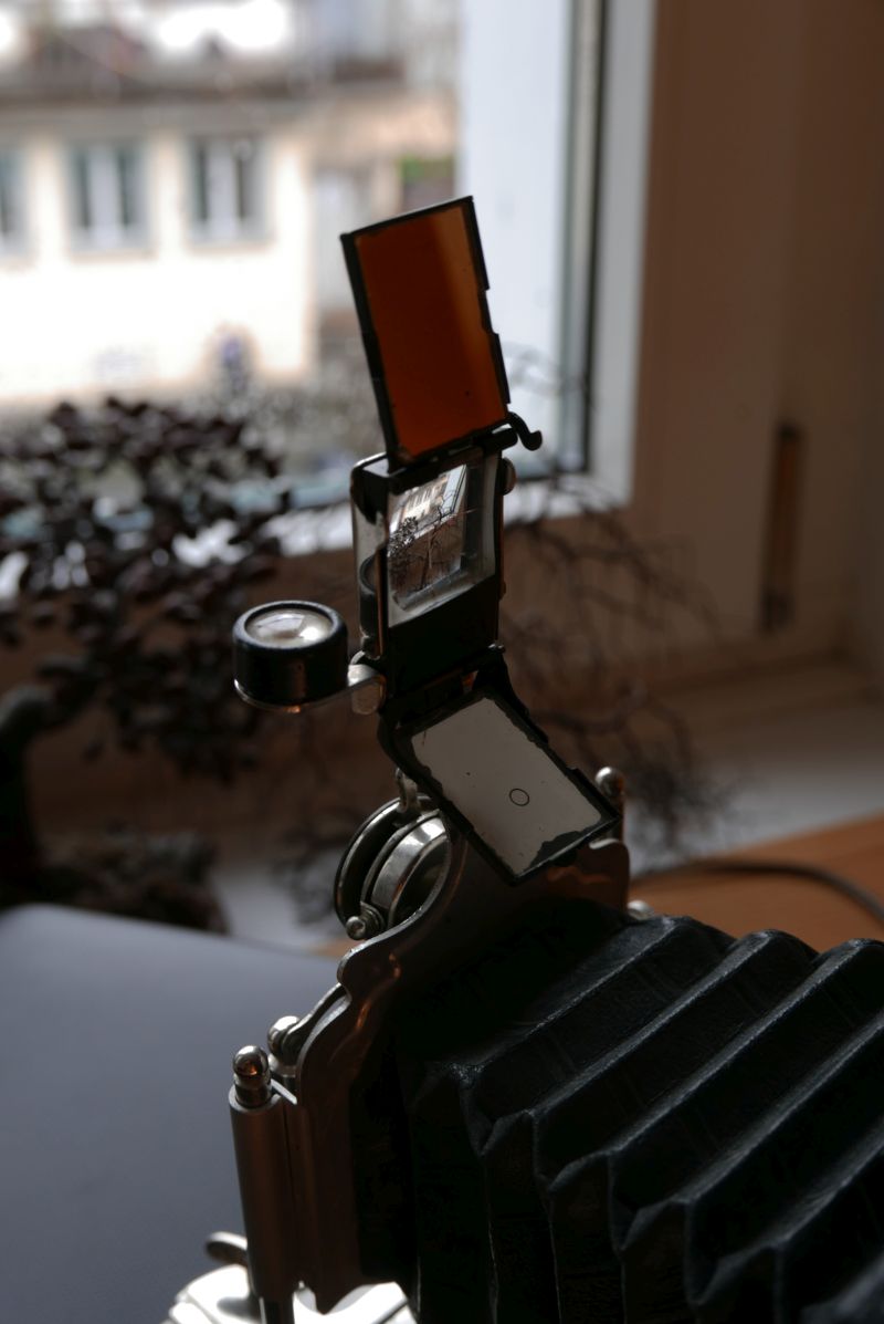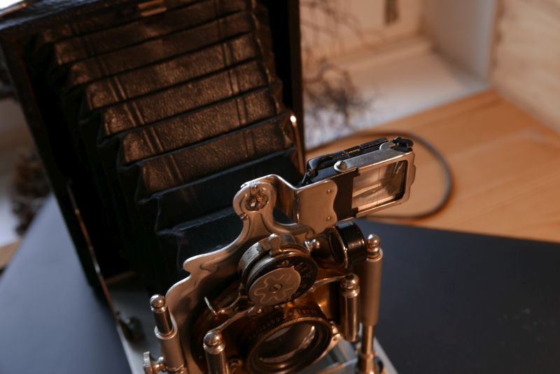 Das Besondere an der Kamera ist der Sucher: Es ist kein Brilliantsucher, sondern ein Newton-Sucher oben am höchsten Punkt des Jugenstil-verzierten Objektivbretts. Der Sucher lässt sich aus der Ruhestellung in die senkrechte drehen und dann können zwei Spiegel ausgeklappt werden. Es ist nun 1. möglich im 45 Grad-Winkel von hinten über das Kameragehäuse über die Spiegel das Bild auf dem Newton-Sucher zu betrachten, oder 2. lässt sich der obere Spiegel nach oben wegklappen, sodass man den Newton Sucher knapp über das Kameragehäuse direkt anvisieren lässt. Das Bild ist dermassen hell und klar, dass es kaum verständlich erscheint, warum sich bei den meisten Kameras dieser Zeit der Brilliantsucher durchgesetzt hat.