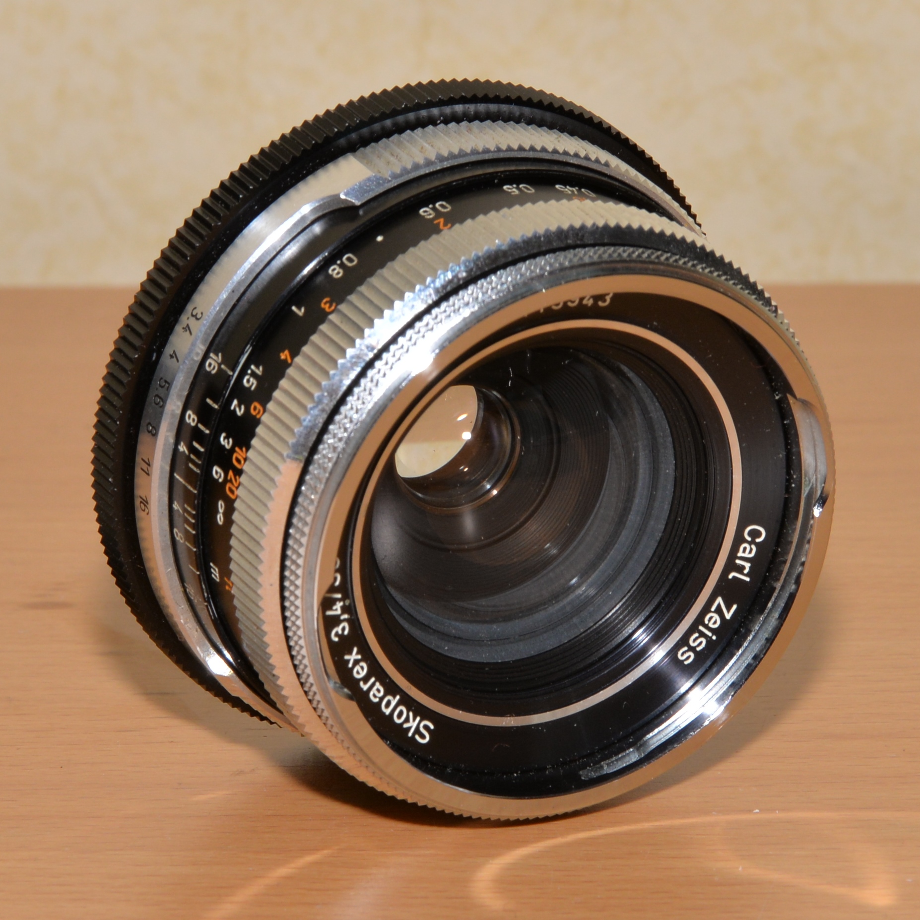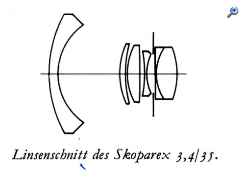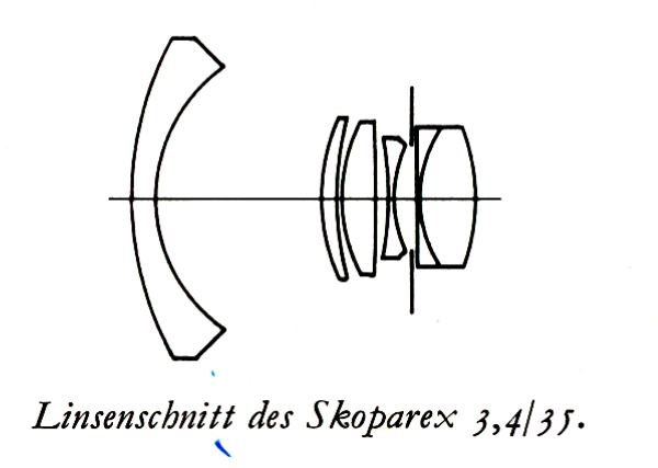 Als die Fa. Zeiss Ikon beschloss die schon von Voigtländer fertig entwickelte "Bessaflex" unter dem eigenen Namen als "Icarex" zu verkaufen übernahm sie gleichzeitig die von Voigtländer gerechneten Objektive. Auch das Skoparex 3,4/35 kommt mit weniger Glas, also auch weniger Gewicht als ein vergleichbares Distagon Objektiv daher. Die Abbildungsleistung ist für meine Begriffe ähnlich gut, ein Fachmann wird hier möglicherweise grössere Unterschiede feststellen.