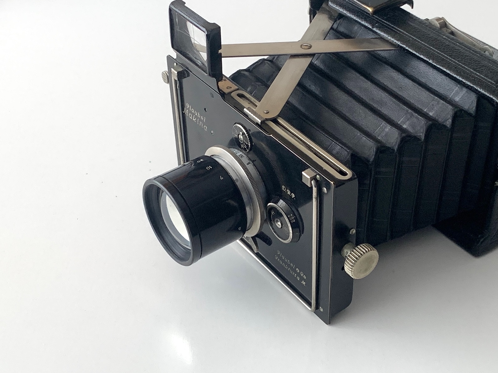 die Plaubel Makina war schon früh als Systemkamera ausgelegt; bereits für das Modell I (--> https://blende-und-zeit.sirutor-und-comp...=1&thread=6) war ein Teleobjektiv lieferbar, das einteilige Makinar 6,3/200, das anstelle des vorhandenen Anticomar-Vorderteils in den Compur eingeschraubt werden kann. Auch das rückwärtige Element muss entfernt werden. Die Brennweite wird nicht explizit angegeben, ergibt sich aber daraus, dass eine zweifache Vergrößerung erreicht wird.