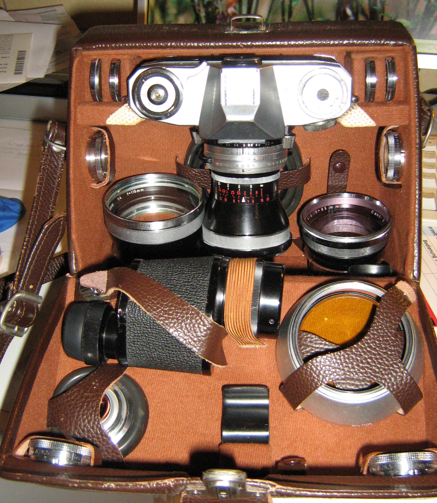 Hier findet alles seinen Platz. Interessant ist, das die erste Serie der 35er und 85er Objektive mit f=1:4 ausgeliefert wurden, ca. 1962 wurde die Maximalblende ohne Konstruktionsänderung mit f= 1:3,2 beschriftet. Diese Blende konnte jedoch an der Contaflex nicht eingestellt werden so daß hier von einem Marketingtrick gesprochen wurde um nicht im Vergleich zur Voigtländer Bessamatic ins Hintertreffen zu geraten. Der drehbare Ring an den Objektiven dient nur zur Ermittlung der Tiefenschärfe und hat ansonsten keine Funktion.