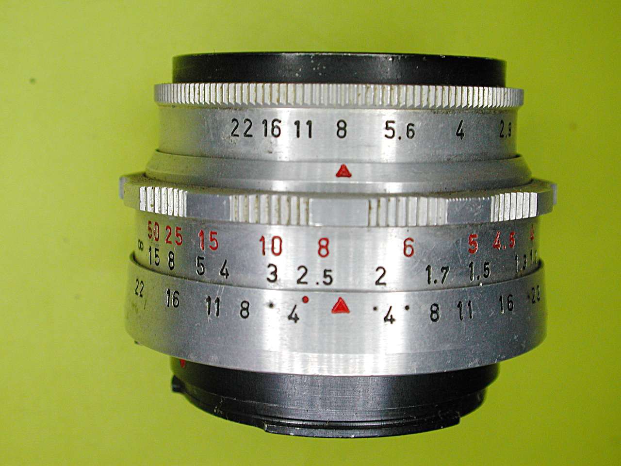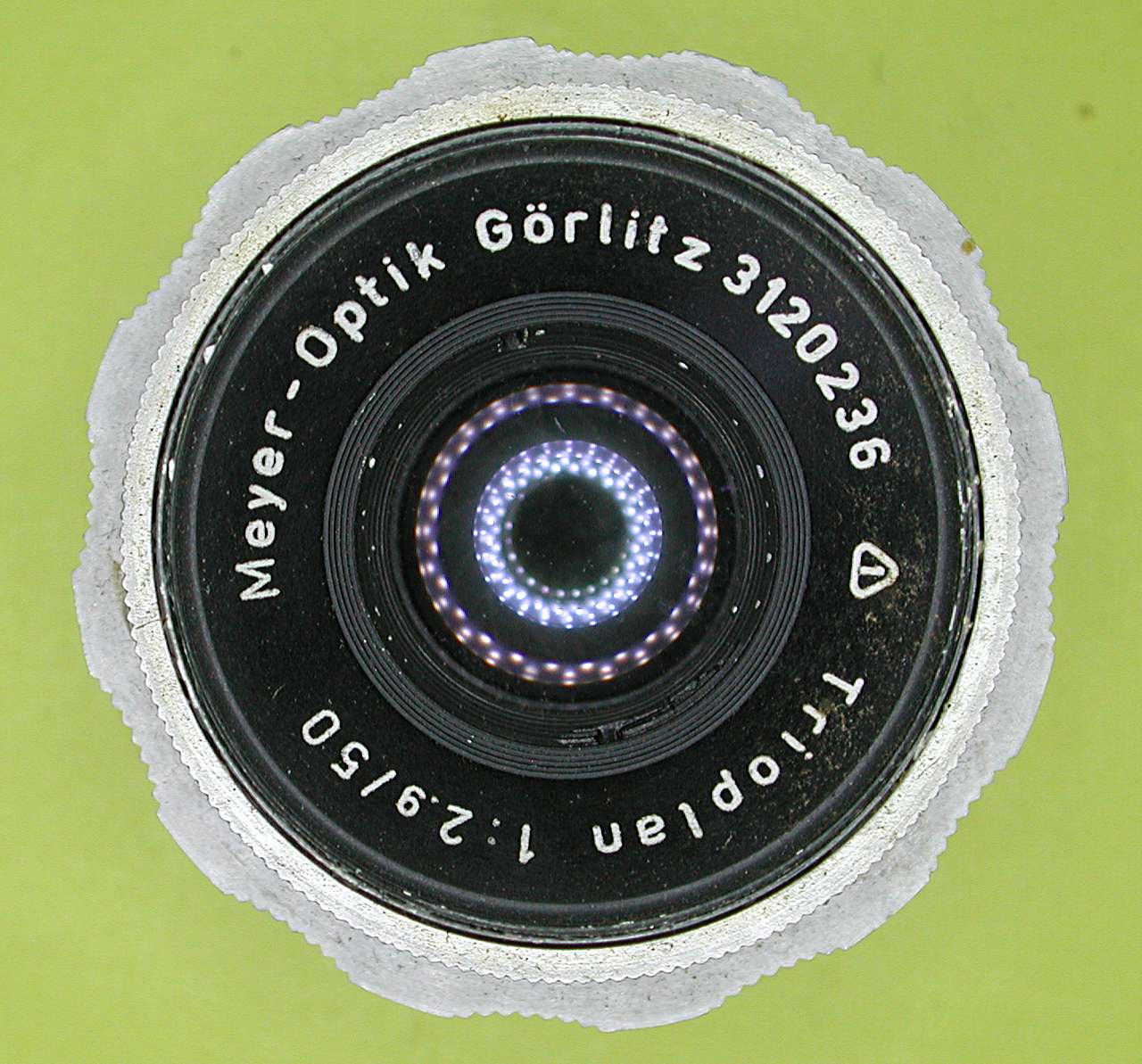 Hersteller: Meyer-Optik (VEB Optisch-Feinmechanische Werke Görlitz) Produktion: Vorstellung des Ur-Trioplan bereits 1916. Laut https://www.dresdner-kameras.de/objektive/objektive.html#Seriennummernkreise deutet die Seriennummer von 3+ Millionen auf einen Produktionsbeginn ab 1961 hin. Gebaut bis 1963. Brennweite: 50mm Blende: 2.9 bis 22 stufenlos, rastend, 12 Blendenlamellen Entfernungseinstellung: manuell 0,6mtr bis Unendlich. Verschoben wird das gesamte Objektiv, das Filtergewinde dreht sich nicht mit. Vergütung: ja Filtergewinde: 35,5mm Einschraubgewinde Länge gemessen: 40mm Durchmesser gemessen: 48,2mm Gewicht, gemessen: 83 Gramm Gütesiegel des gezeigten Exemplars: "1" im Dreieck, mit Weltmarkterzeugnissen vergleichbar Neupreis einzeln: 52DM Bemerkung: Das Trioplan ist heute ein gesuchtes Gebraucht-Objekt, weil ihm ein sehr schönes "Seifenblasen-Bokeh" zugeschrieben wird. Es erzielt in der 50mm-Version im Versteigerungshaus Preise von über 50 bis über 100 Euro. Der Versuch einer Neuauflage im Crowd-Funding für 1400 Euro hingegen verlief im Sand.