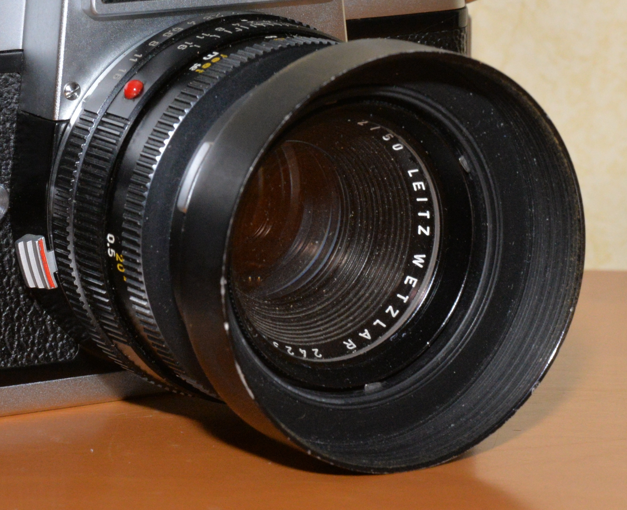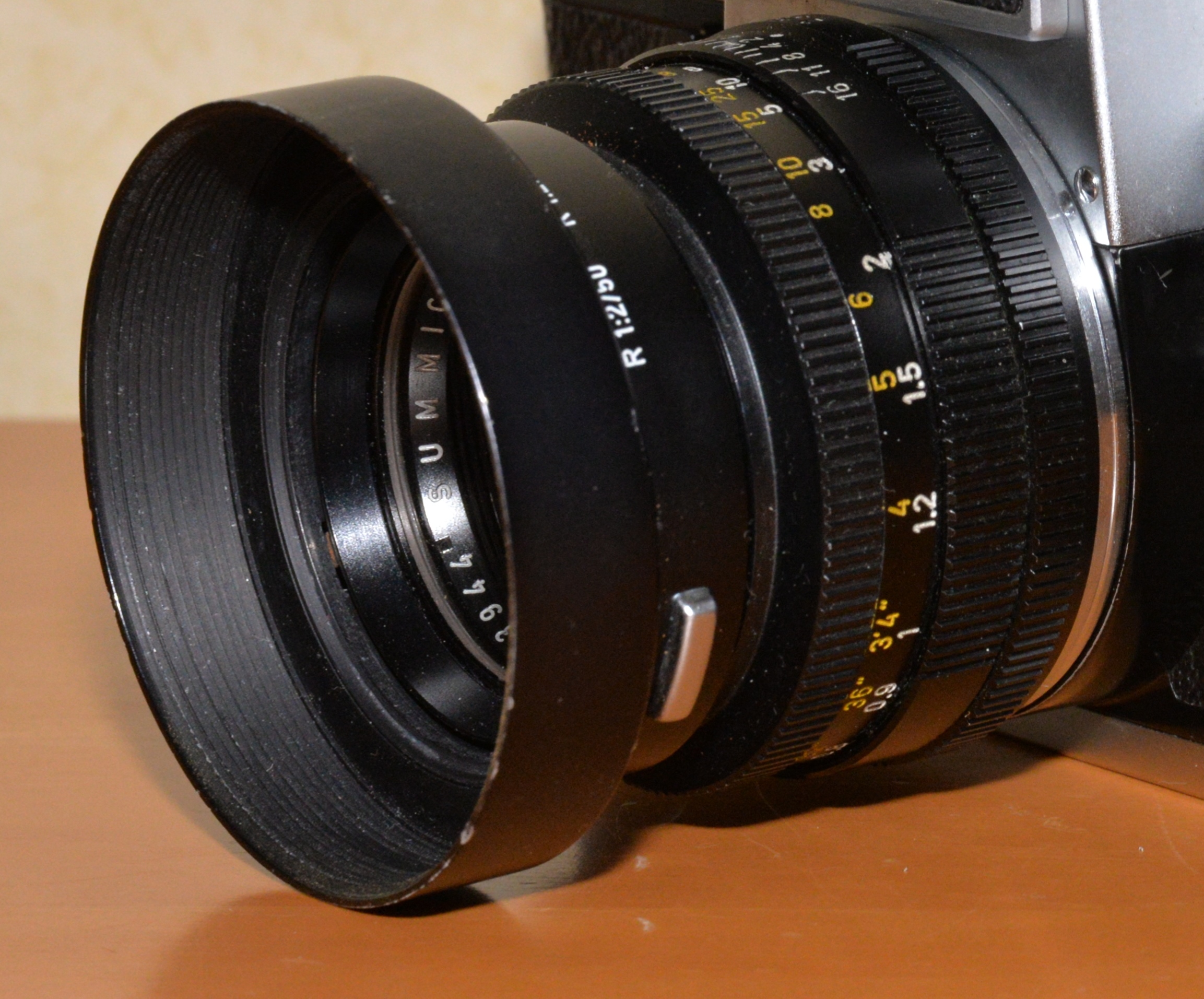 Als in Deutschland 1964 die erste Leicaflex in die noch größtenteils von einheimischen Produkten beherrschten Fotoläden kam, war auch das Summicron in seiner ersten Ausführung dabei. Als Standardobjektiv angeboten, brauchte es sich hinter dem Zeiss Planar in Punkto Abbildungsleistung nicht verstecken. Als Kritikpunkte galten lediglich die maximale (kleinste) Blende von f=16 und die recht hohe Naheinstellgrenze von 0,5 Metern. Ansonsten ist das Summicron ein wunderbar handliches Objektiv mit exakt definierten Blendenrasterungen und einer griffsympathischen Entfernungseinstellung. Warum aber Leica bei den ersten Objektiven die heute kaum noch erhältlichen Serienfilter montierte, bleibt wohl ein Geheimnis.