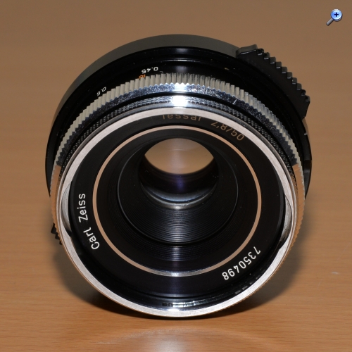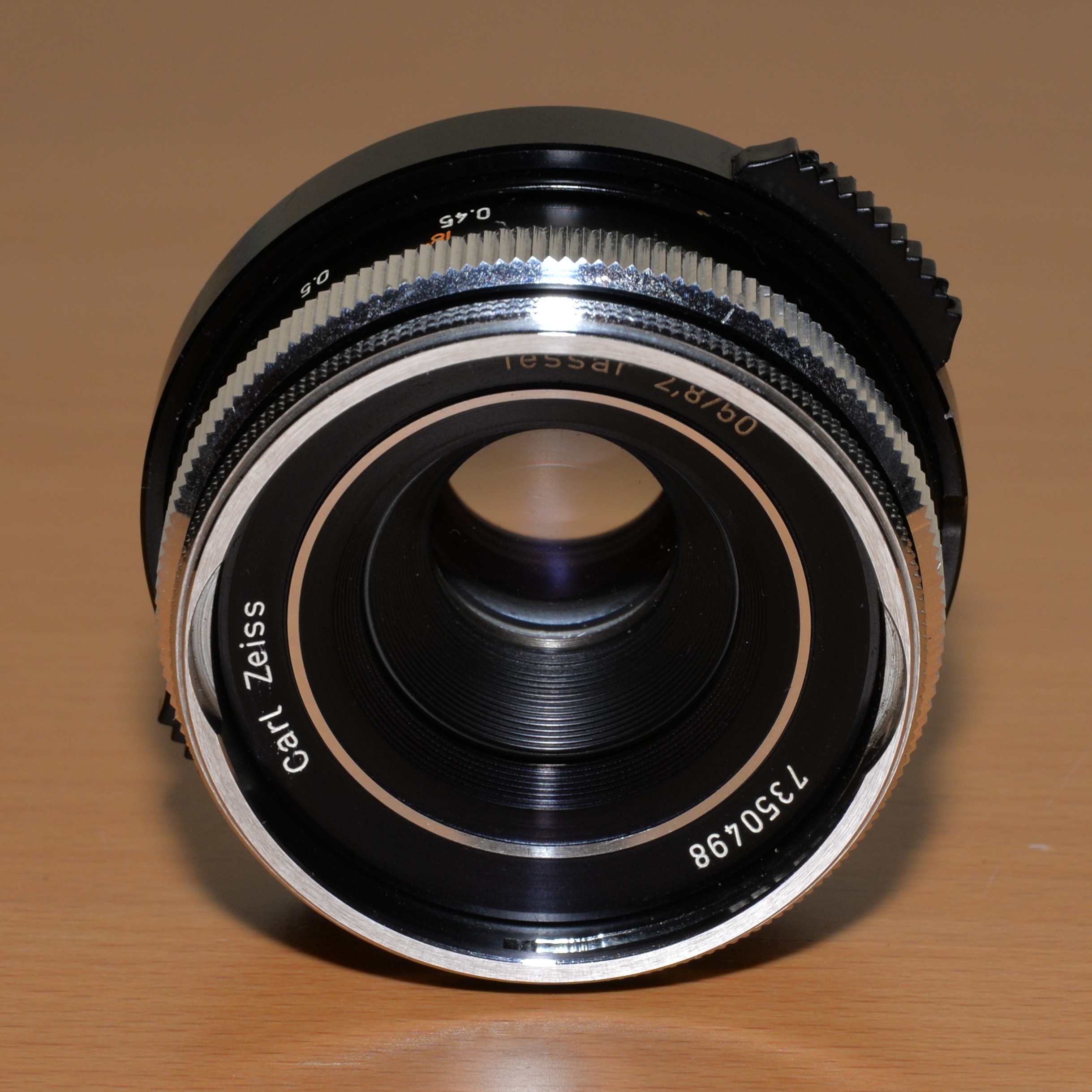 Als die Fa. Zeiss Ikon beschloss die schon von Voigtländer fertig entwickelte "Bessaflex" unter dem eigenen Namen als "Icarex" zu verkaufen übernahm sie gleichzeitig die von Voigtländer gerechneten Objektive. Ausnahme war das bewährte Zeiss Tessar das hier in der Ausführung für den M 42 Gewindeanschluß gezeigt wird. Auffällig ist, dass das Objektiv schon mit der Blendenabtastung ausgerüstet ist, die erst mit der glücklosen Zeiss Ikon SL 706 zur Wirkung kam. (Offenblendemessung)
