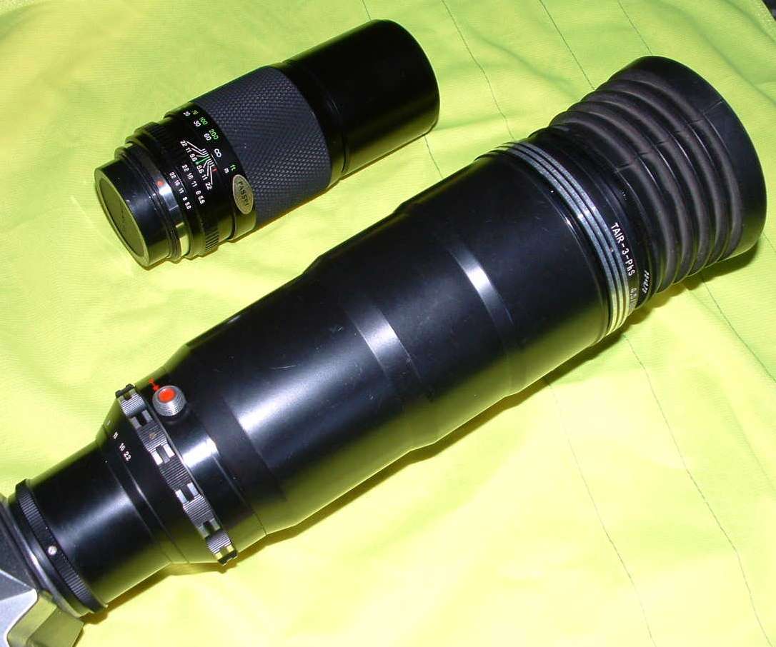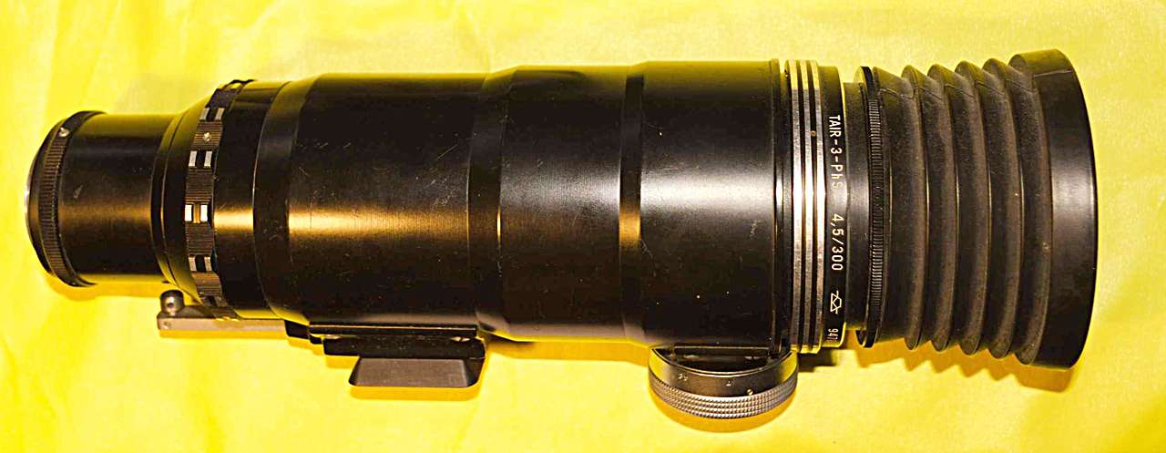 Daten Hersteller: das Krasnogorsker S.A.Swerew-Werk (KMZ) bei Moskau Bauzeit, alle Varianten, für die Version 3: 1955-2005 Optischer Aufbau: 3 Elemente in 2 Gruppen (m.E. kein "echtes" Tele, dessen Baulänge kürzer als die effektive Brennweite sein müsste) Anschlußgewinde des gezeigten Objektives: M42x1 Brennweite: 300mm Blende: 4.5 bis 22, 16 Blendenlamellen, Blendenvorwahl mit manuell vorzuspannender Springblende Filtergewinde: 72x0.75 Entfernungseinstellung: 3 Meter bis Unendlich, über Drehknopf an der Unterseite Vergütung: orange, für gute Farbtreue Ab 1990 Multi-Coating bei der Exportversion Zubehör: spezielle Streulichtblende, flexibel Stativgewinde: im Schwerpunkt der Kamera-Objektiv-Konstruktion (auf dem Bild ist eine Schnellverbindung für moderne Stative eingeschraubt, die nicht zu der Konstruktion des Tair Objektives gehört). Auf dem Stativ wird das Tair mit der Kamera, ohne Gewehrschaft, montiert. Dann muss die Springblende vor der Aufnahme separat ausgelöst werden. Länge: ca. 246mmm Durchmesser: ca. 120mm incl. Fokusknopf Gewicht allein: ca. 1.4kg Bemerkungen Fortentwicklung: Photosniper FS-12 mit der Zenit 125. Diese hatte TTL Messung statt der Selenzelle über dem Objektiv und eine elektronische Übertragung von Einstellwerten zwischen Kamera und Objektiv. User Manual speziell für das hier vorgestellte Exemplar Tair-3PhS mit der Zenit-ES auf http://www.commiecameras.com/sov/35mmsinglelensreflexcameras/cameras/photosniper/manuals.htm