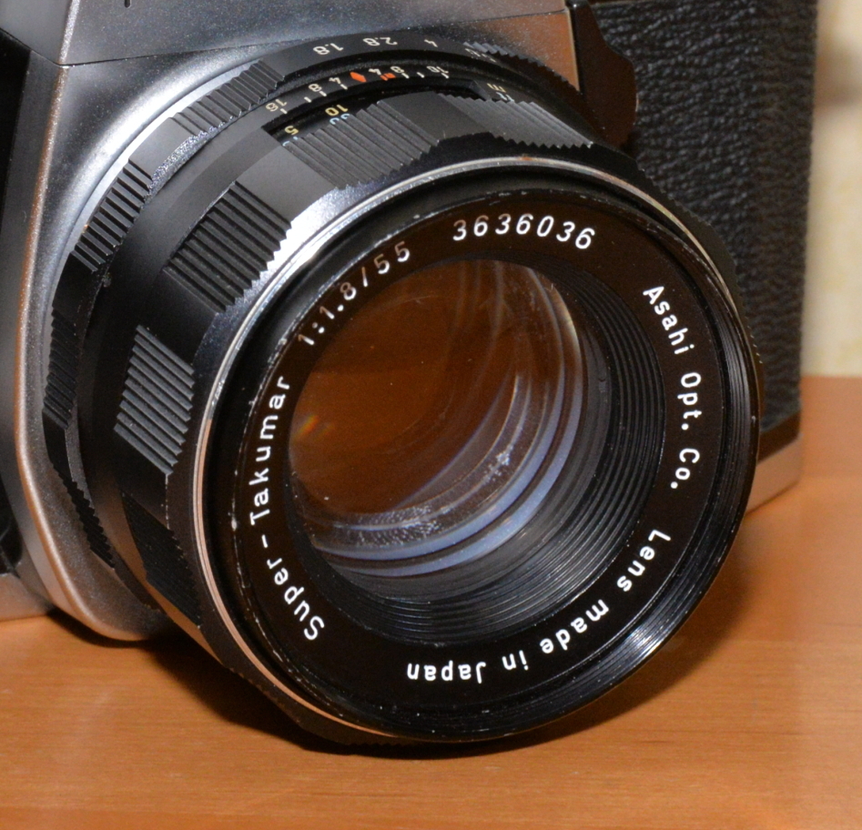 Ein ausgezeichnetes Standardobjektiv mit M 42 Schraubgewinde fertigte die japanische Firma Asahi Pentax. Mit Einführung der automatischen Springblende führten die Objektive den Namen "Super Takumar". Die Objektivkonstruktion lehnt sich an die Zeiss Sonnare an, also 6 Linsen in 5 Gruppen. Die Bildleistung war und ist von hoher Güte. Ein ideales Objektiv für jede Kamera mit M42 er Gewinde. Auch digital sehr gut verwendbar.