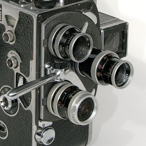 Das Objektiv am Wechselrevolver der Bolex H8 montiert (oben):