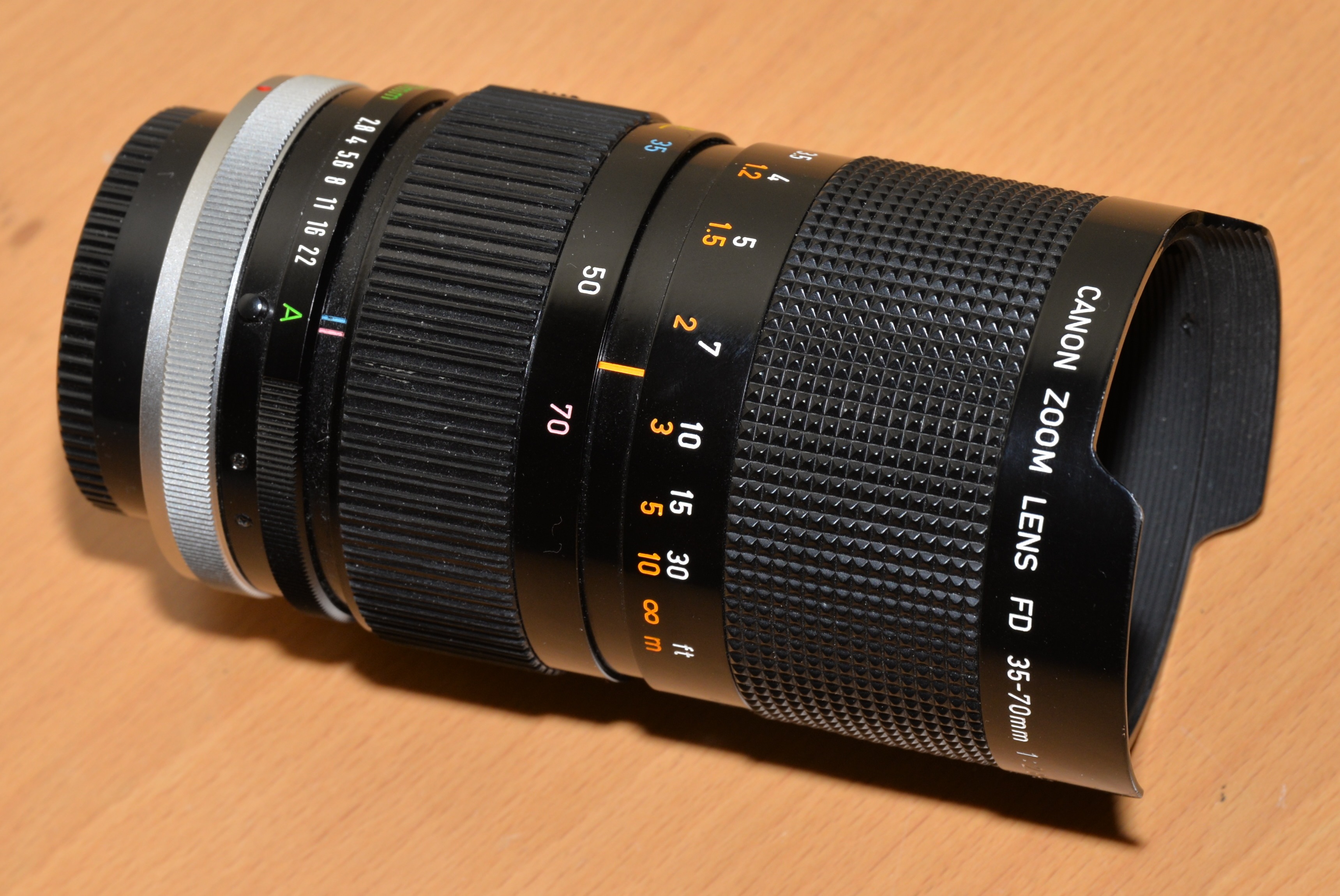 Ein Objektiv mit einem Namen der fast so lang ist wie das ganze Gerät. Dennoch ist das handliche Zweifachzoom das 1973 auf den Markt kam erfreulich leicht bedienbar und glänzt auch heute noch durch eine hohe Lichtstärke. Bei der Konstruktion ging Canon einen neuen Weg: "Mit zwei Objektivgruppen wird eine eine Bildqualität erreicht, die so hoch ist wie die eines Objektivs mit einer Brennweite" (Zitat Canon) Schön ist auch die Makrofunktion die einen Bildabstand von 0,3 Metern erlaubt