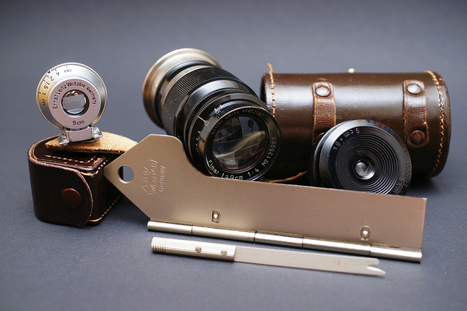 dieses unvergütete Leitz Elmar f=9 cm, 1:4 mit Leica Schraubgewinde stammt aus dem Jahr 1932. Der ebenfalls abgebildete Sucher (SGVOO) wurde ab 1951 hergestellt.