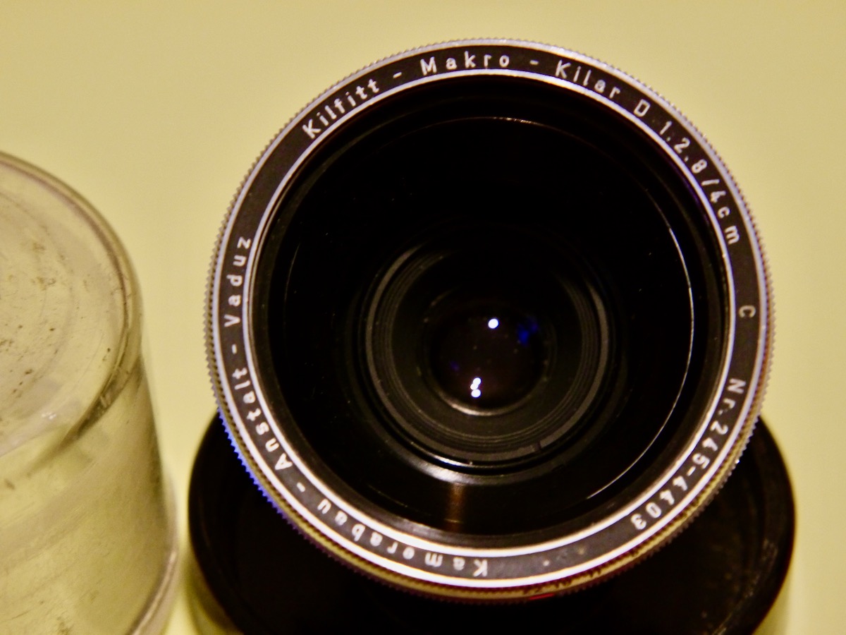 Baujahr 1956 (vorher 3,5/50mm), erstes Makroobjektiv für 35mm Hersteller: Kamerabau-Anstalt-Vaduz, Fürstentum Liechtenstein Konstruktion: Heinz Kilfitt, Kilfitt Optische Werke, München Linsenkonstrukion: 4 Linsen in 3 Gruppen Triplet Tessartyp Blende 2,8-22,10 Lamellen Brennweite: 4cm Entfernungseinstellung: 5 cm (1:1) bis Unendlich (Makro-Kilar E nur 1:2-Unendlich), doppelter Schneckengang Anschluß: Exakta-Bajonett (gab es auch für ALPA, Rectaflex, Praktina und M42) Gewicht: 170g