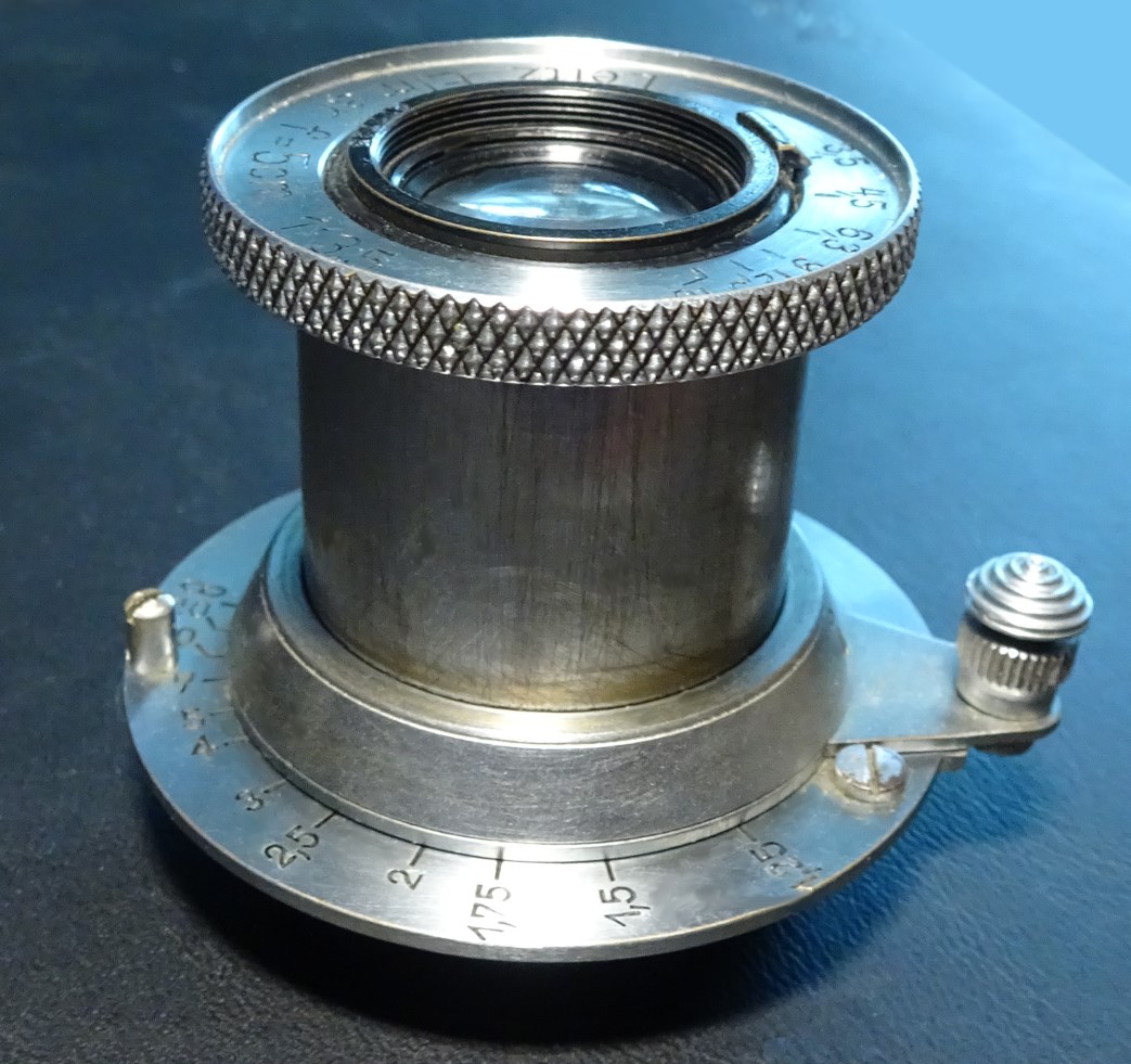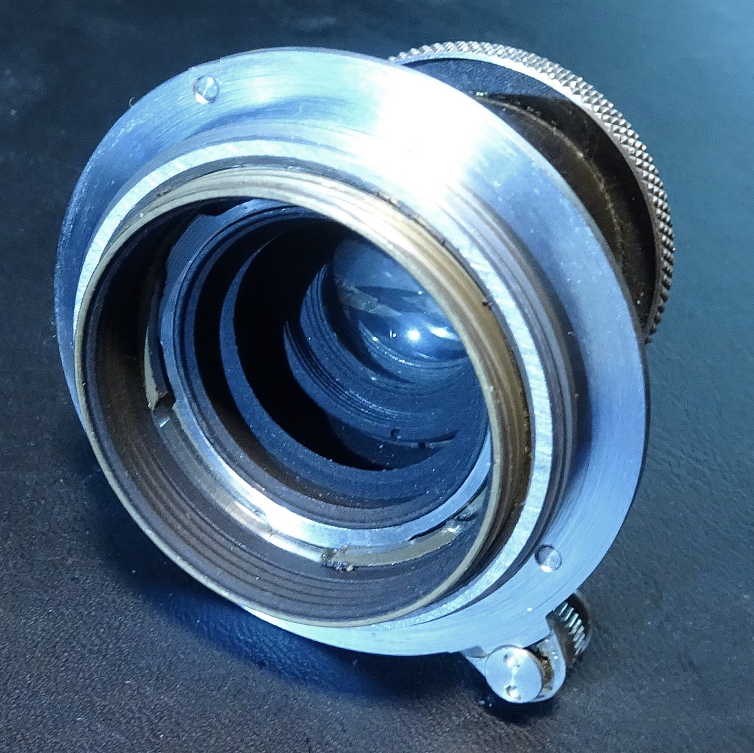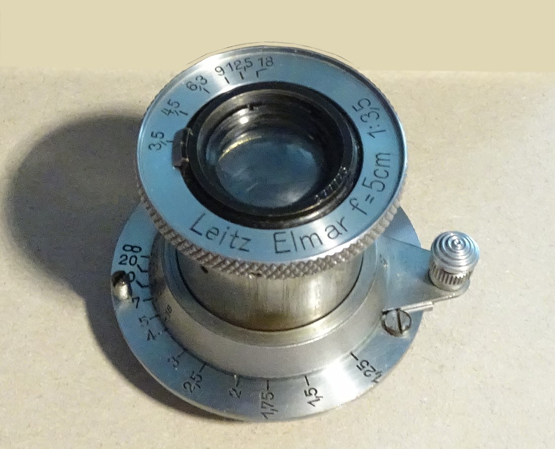 hier eines der "Arbeitspferde" der Leica-Kamera-Objektive das Leitz Elmar 3,5 / 50 mm Schraubgewinde-Objektiv, auch einsetzbar bei der Leica 3c.