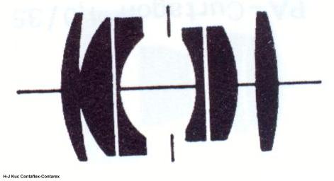 1.Linsengruppe bestehend aus Frontlinse freistehend(auf der Skizze nicht gut zu erkennen) 2. Linsengruppe bestehend aus 2 verkitteten Linsen Blende 3. Linsengruppe bestehend aus 2 verkitteten Linsen 4. Linsengruppe bestehend aus 1 Linse