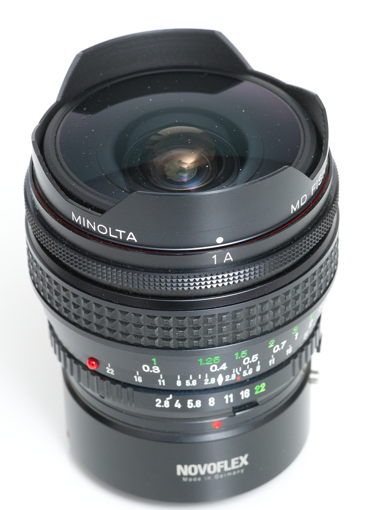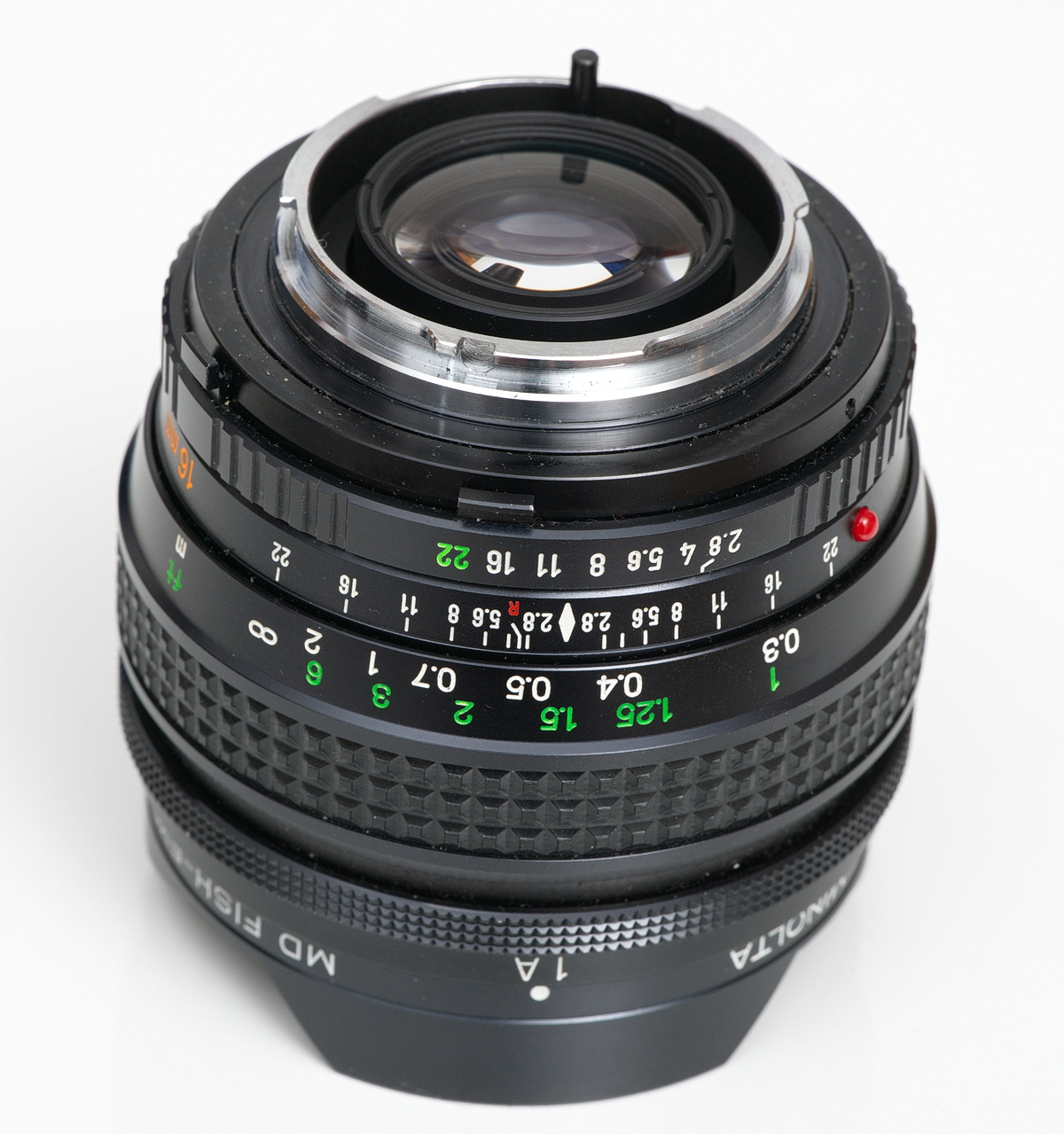 Das Bild wird bei diesem Fisheye bis in die Ecken ausgeleuchtet. Der Bildwinkel beträgt 180° diagonal. Brennweite: 16 mm Lichtstärke: 1:2,8 11 Elemente in 8 Gruppen Nahgrenze: 0,3 m Blendenwerte: 2,8 bis 22 4 eingebaute umschaltbare Filter: Normal, Gelb, Orange, 80B d = 70,5 mm l = 63,5 mm m = 440 g