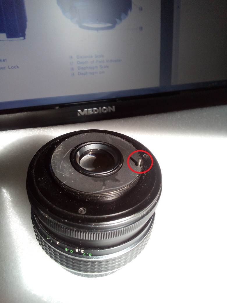 das Problem mit dem Adapter hat mich nicht losgelassen und so habe ich weiter recherchiert. Ich konnte mir einfach nicht vorstellen, dass das gekaufte Teil so fehlerhaft sein könnte. Und richtig, das Problem liegt nicht am Adapter sondern am Objektiv. Genauer gesagt am fehlenden Übertragungspin für die Blendenverstellung (hier rot eingezeichnet)
