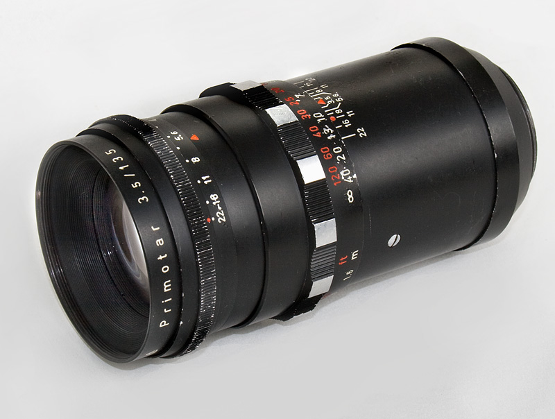 Das langbrennweitige Primotar wurde in Görlitz (ehem. DDR) in unzähligen Varianten und Ausführungen von 1959 - 1965 produziert. Das Objektiv vom Tessar-Typ zeichnete sich durch ausgezeichnete Schärfe und robuste Bauweise aus. Das Objektiv trägt das DDR-Qualitätsprädikat "S" (Ein S in einem Dreieck).
