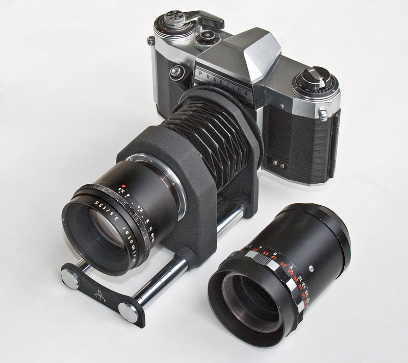 Zur Verwendung mit einem Balgengerät ist der Objektivkopf abschraubbar. Es gab Adapterringe für M42 Gewinde und Exakta Bajonett. Der Fokussierbereich reicht mit dem Pentacon Balgengerät von Unendlich bis ca. 45 cm.