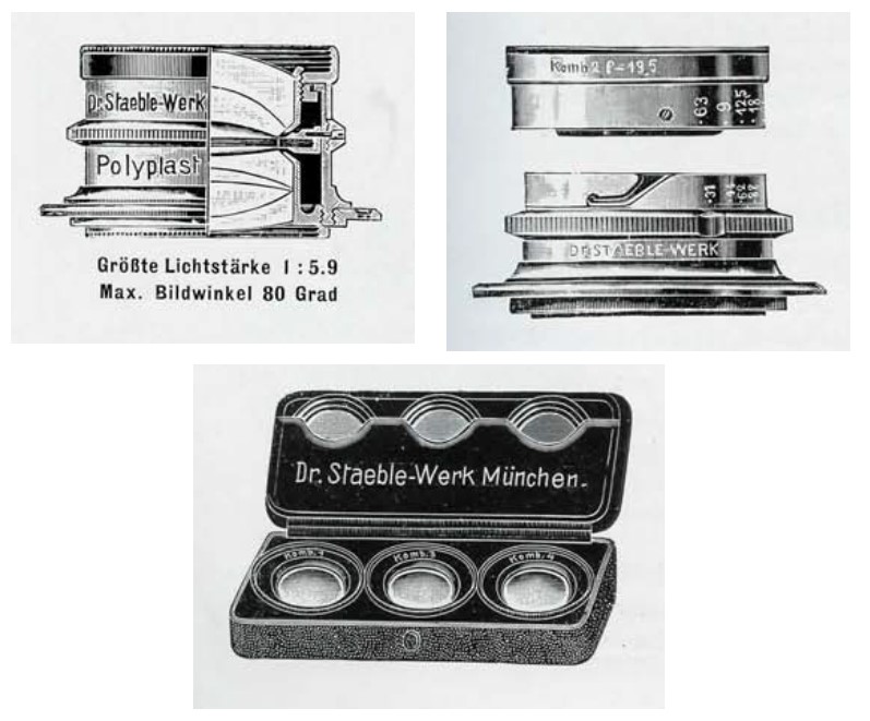 Bildzitat aus Staeble-Katalog, Seiten 31-33 von 1911: Links: Vorderlinse heraus-schraubbar. Rechts: Vorderlinse via Bajonett entnehmbar Obere Reihe im Set. 3 Gelbfilter Untere Reihe im Set. 3 Anastigmate als Vorderlinsen zur Bildung verschiedener Brennweiten.
