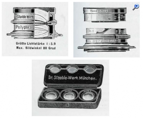 im Staeble-Katalog von 1911 wird u.a. ein unsymmetrischer Doppelanastigmat Polyplast beschrieben, der eine entnehmbare Vorderlinse (schraubbar oder per Bajonett) hat. Weiter kann das System auch als Set erworben werden, auch zum späteren Zukauf. Damals waren wohl die meisten Anastigmate symmetrisch aufgebaut, die Vorder- und Hinterlinsen hatten gleich viel Elemente.