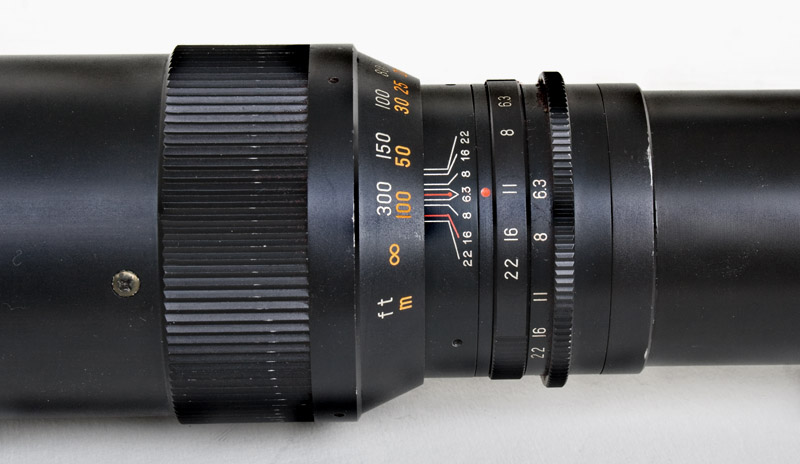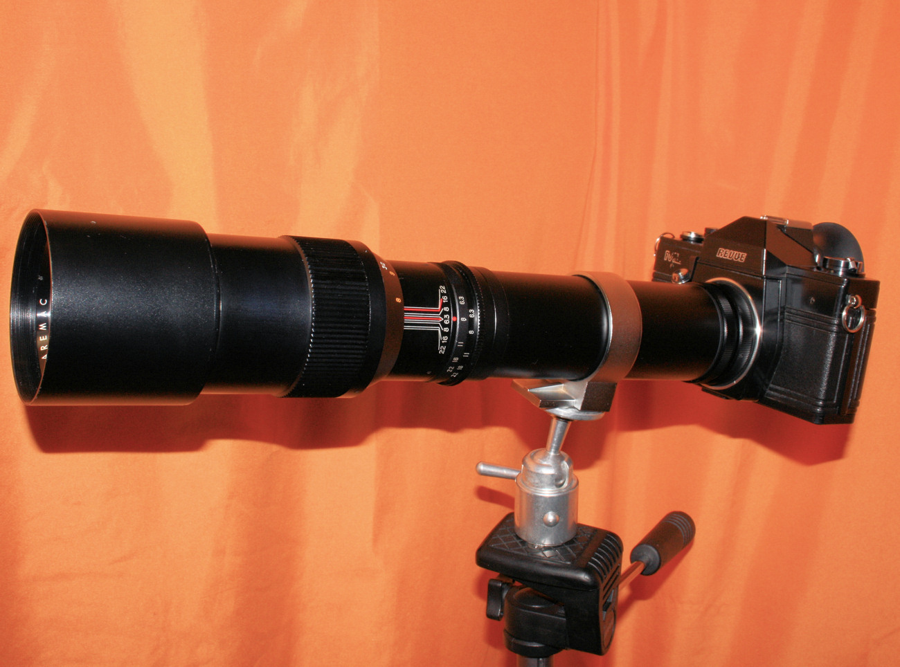 Es nennt sich Aremac, hat ebenfalls die Werte 6,3/400 mm und ist garnichtmal so schlecht für die 12 Euro, die ich dafür ausgegeben habe. Es hat einen T2 Anschluss, Adapterstücke für M42, Canon FD und Olympus OM liegen bei (alleine die Adapter wären schon pro Stück so teuer, wie die ganze Chose gekostet hat). Die Vorwahlblende ist ebenfalls manuell und reicht bis 22. Die Mindesteinstellung für die Entfernung am Ring ist mit 8 m angegeben, läßt sich aber noch ein gutes Stück weiter zurück drehen (auf gefühlte 7 m).