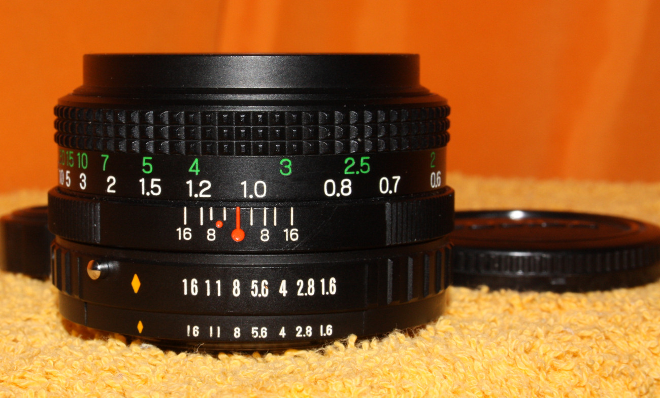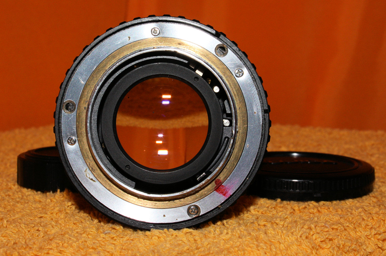 Ersteigert für 1 Euro, weil niemand sonst drauf bieten wollte, war das mein erster Versuch, einen Umbau zu wagen. Mangels eines geigneten, auf Canon passenden Endstücks, habe ich es unter Zuhilfename eines ausgemusterten 35 mm Revuenon auf M42 umgebaut. Das Schwierigste war, den Gewindering soweit abzuschleifen und das Objektivende soweit zurückzubauen, das das Auflagemaß erreicht wird. Das ist mir nicht ganz gelungen, unendlich läßt sich nicht einstellen, aber für den Nahbereich bis ungefähr 2 m ein sehr gutes Objektiv. Die Naheinstellung hat sich dafür bis auf etwa 10 cm verändert. Vielleicht bekomme ich mal ein ausgemustertes EF-Objektiv mit geignetem Metallbajonett in die Finger, dann gewinne ich 1,5 mm und komme Unendlich wieder näher. Leider werden auch defekte Objektive noch teuer gehandelt, wenn sie nicht grade ein Plastikbajonett haben.