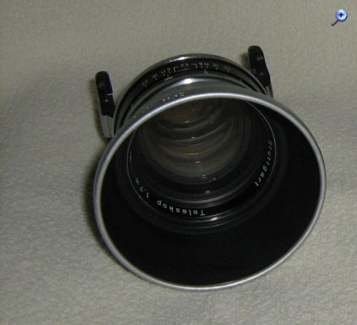 Ende 1954 war es dann soweit: Das Teleskop 1,7fach wurde angeboten. Zum Preis von nur 230.- DM konnte man mit einer Brennweite von ca. 76mm auf Portraitsuche gehen. Doch Halt: eine Vorsatzstandarte für nur 25.- DM musste auch noch erworben werden um das Teleskop an der Kamera zu befestigen.