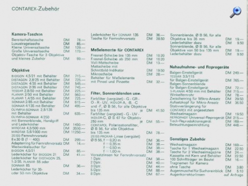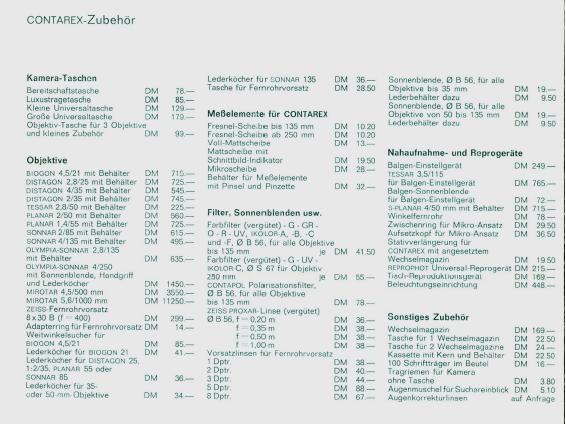 ich habe gerade mal im "Deutschen Photokatalog" 1967 nachgesehen. Da hat die Contarex ohne Objektiv 1149 DM gekostet und das Sonnar 2/85 immerhin noch 615 DM, also mehr als die Hälfte des Bodys. Und das war damals noch richtiges Geld. Durchschnittsgehalt 1967 700-1200 DM. Ich hatte damals als junger Techniker direkt nach der Ausbildung 820 DM im Monat. Man konnte also von der Contarex eigentlich nur träumen......