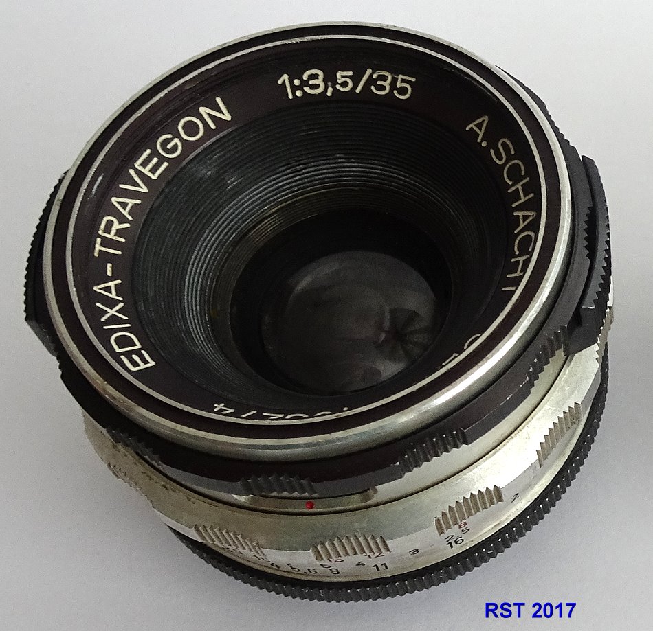 das Edixa Travegon 1:3,5 / 35 mm gehört zur Wirgin Edixa D Spiegelreflex-Kamera. Es ist ein leichtes Weitwinkel-Opjektiv. Der Hersteller ist A. Schacht, Ulm. Es verfügt über eine Springblende mit zwei Steuermöglichkeiten, die Springblende muß von Hand nachgespannt werden.