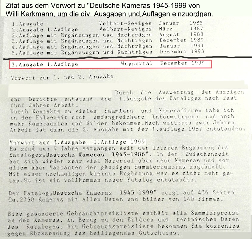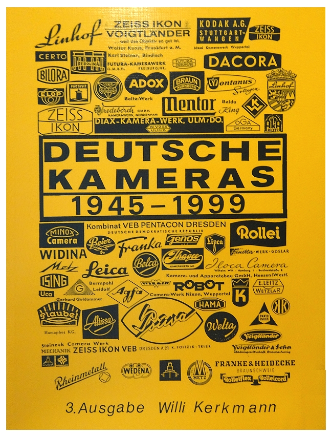 Deutsche Kameras 1945-1999. ISBN 3-00-004635-6 Redaktionsschluß 12.1999 Autor Willi Kerkmann, Wuppertal DinA4 Format, 2 cm dick 436 Seiten, ca. 2750 Kameras, Stichwortverzeichnis 11 Seiten, Inhaltsverzeichnis 22 Seiten, Schwarz-Weiss-Darstellung.