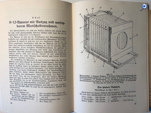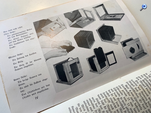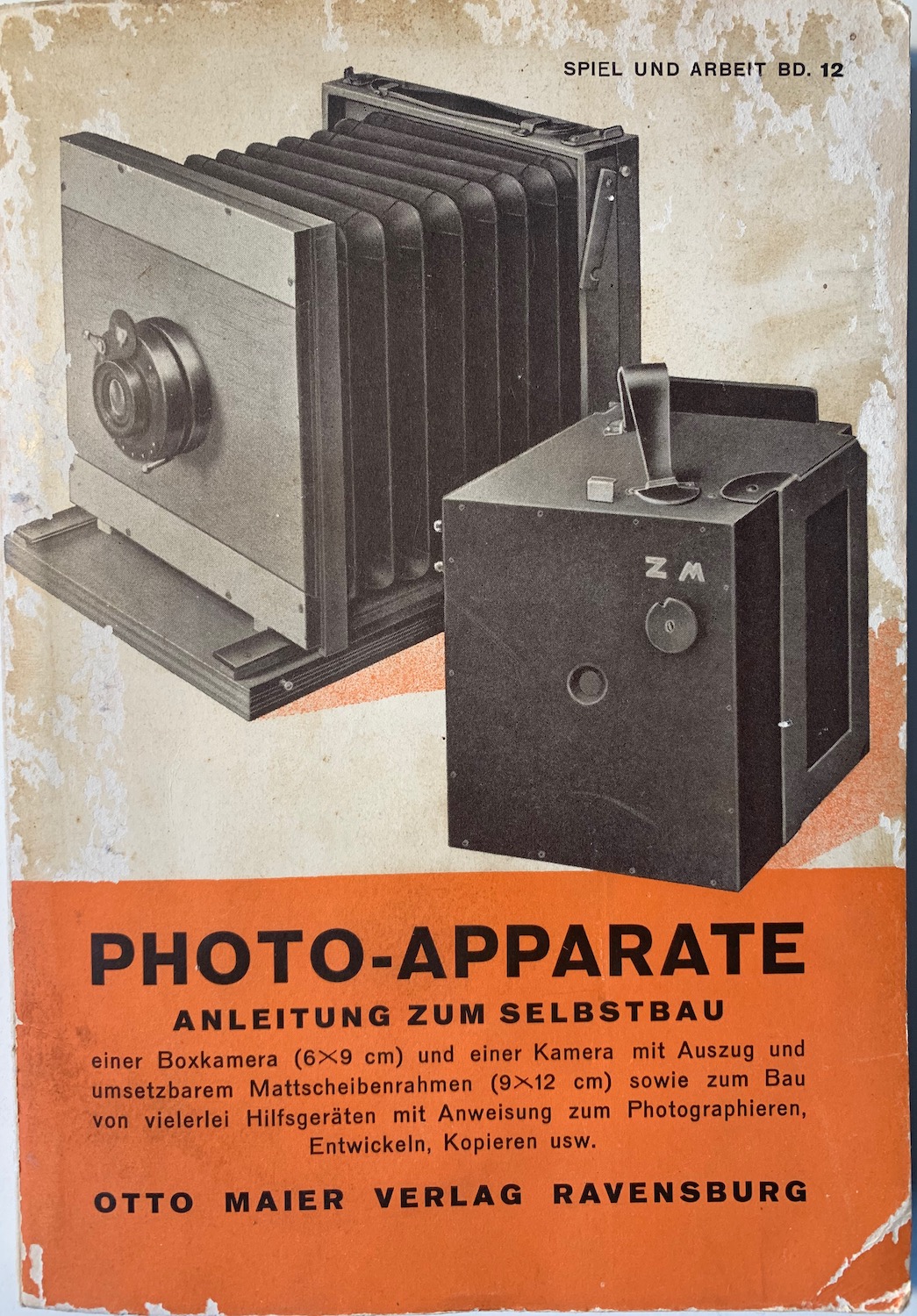 der Selbstbau technischer Geräte scheint in früheren Jahrzehnten ein unter Jugendlichen stark verbreitetes Hobby gewesen zu sein. Das gilt nicht nur für Radios usw., sondern auch für Kameras. Wohl um 1930 erschien als Band 12 der Reihe „Spiel und Arbeit“ des Verlags Otto Maier der vorliegende Band mit der "Anleitung zum Selbstbau einer Boxkamera und einer Kamera mit Auszug und umsetzbarem Mattscheibenrahmen".