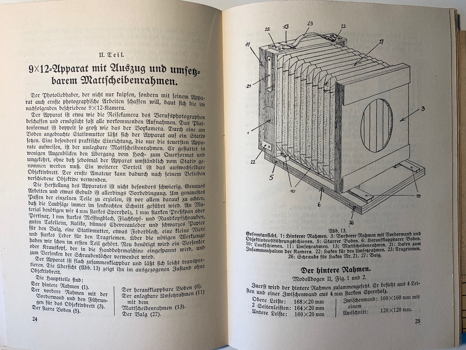 Die Selbstbauvorschläge betreffen alle Bauteile; für die Boxkamera wird auch der Bau eines einfachen Verschlusses gezeigt; alternativ wird auf die Möglichkeit verwiesen, eine käuflichen Verschluss zu verwenden. Auch die Balgenkamera soll vollständig selbst hergestellt werden; nur für Objektiv und Verschluss empfiehlt der Verfasser, sich auf dem Gebrauchtmarkt umzusehen und das beste Objektiv zu kaufen. Trotzdem zeigt er alternativ den Einbau einer Landschaftslinse. Interessant finde ich, dass auch der Balgen selbst hergestellt werden soll – aus Kaliko, das man beim Buchbinder bekommen soll und das mit einer Auflage aus schwarzem Papier lichtdicht gemacht werden soll. Die Ecken bestehen aus echtem (Ziegen-)Leder. Die Anleitung erstreckt sich über eine Seite, am Ende bemerkt der Verfasser: „Die Beschreibung klingt etwas schwer. Man lese die Anleitung einige Male genau durch, gehe mit Überlegung an die Arbeit und man wird überrascht sein, wie einfach und leicht die Herstellung des Balgs ist.“ (S. 29)