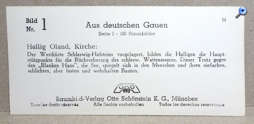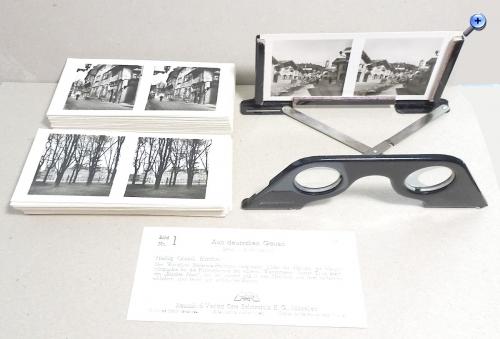 der Raumbild-Verlag Otto Schönstein KG aus München brachte eine Raumbild-Serie mit 100 Stereo-Aufnahmen im Format 13 x 6 cm (Bildkarton), jeweils 2 mal 5 x 5 cm Bildfläche in schwarz-weiss heraus. Titel der Serie: "Aus deutschen Gauen" (Aus damals deutschen Regionen), das deutet auf Aufnahmen aus den 30-iger Jahren hin. Schon von dem Motiven her Zeitdokumente.