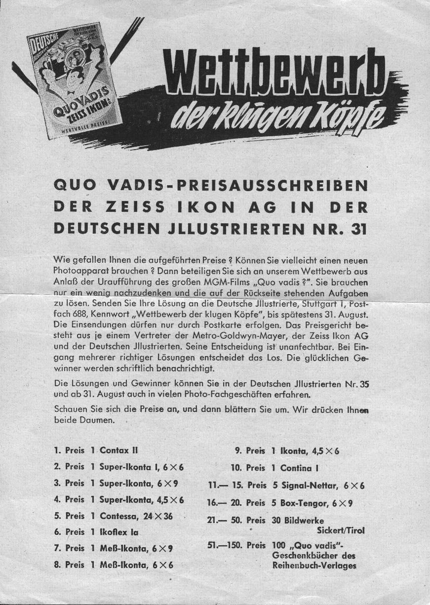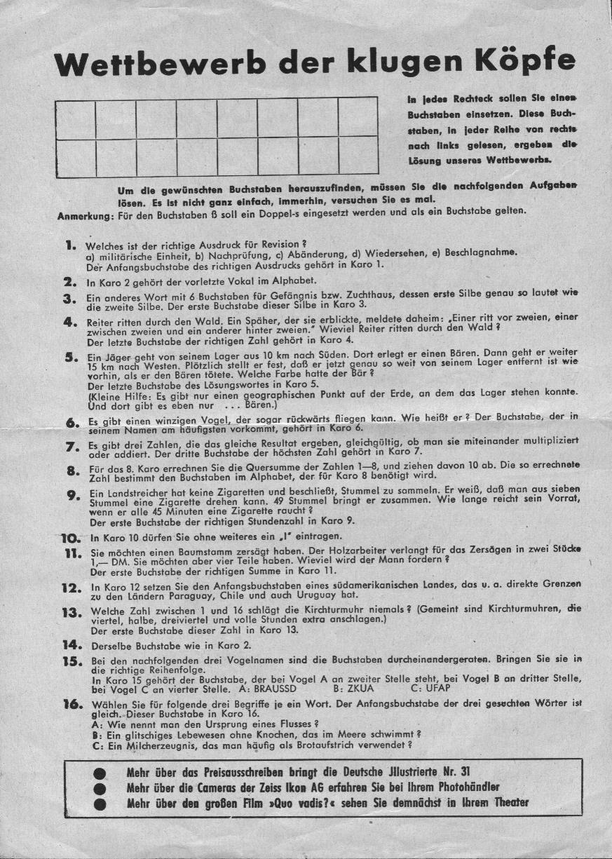 Anbei ein Preisausschreiben aus dem Jahre 1954. Da der Einsendeschluss bereits verstrichen ist, können die ausgelobten Preise leider nicht mehr vergeben werden. Wer die Lösung rausbekommt, darf sich trotzdem freuen. Viel Spaß!